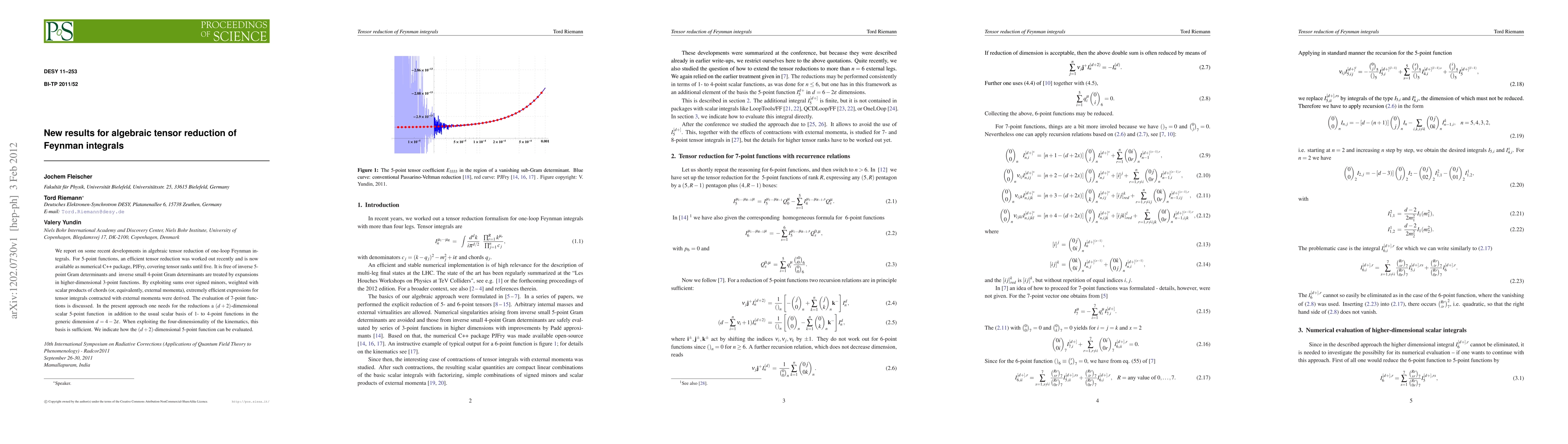 We report on some recent developments in algebraic tensor reduction of one-loop Feynman integrals. For 5-point functions, an efficient tensor reduction was worked out recently and is now available as numerical C++ package, PJFry, covering tensor ranks until five. It is free of inverse 5-point Gram determinants, and inverse small 4-point Gram determinants are treated by expansions in higher-dimensional 3-point functions. By exploiting sums over signed minors, weighted with scalar products of chords (or, equivalently, external momenta), extremely efficient expressions for tensor integrals contracted with external momenta were derived. The evaluation of 7-point functions is discussed. In the present approach one needs for the reductions a $(d+2)$-dimensional scalar 5-point function in addition to the usual scalar basis of 1- to 4-point functions in the generic dimension $d=4-2 \epsilon$. When exploiting the four-dimensionality of the kinematics, this basis is sufficient. We indicate how the $(d+2)$-dimensional 5-point function can be evaluated.