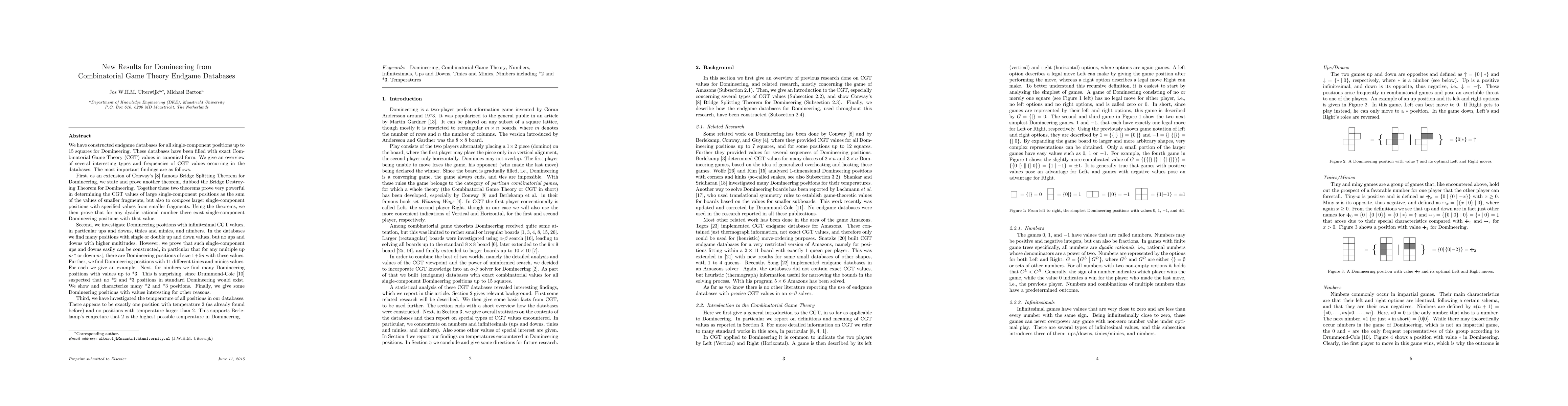 We have constructed endgame databases for all single-component positions up to 15 squares for Domineering, filled with exact Combinatorial Game Theory (CGT) values in canonical form. The most important findings are as follows. First, as an extension of Conway's [8] famous Bridge Splitting Theorem for Domineering, we state and prove another theorem, dubbed the Bridge Destroying Theorem for Domineering. Together these two theorems prove very powerful in determining the CGT values of large positions as the sum of the values of smaller fragments, but also to compose larger positions with specified values from smaller fragments. Using the theorems, we then prove that for any dyadic rational number there exist Domineering positions with that value. Second, we investigate Domineering positions with infinitesimal CGT values, in particular ups and downs, tinies and minies, and nimbers. In the databases we find many positions with single or double up and down values, but no ups and downs with higher multitudes. However, we prove that such single-component ups and downs easily can be constructed. Further, we find Domineering positions with 11 different tinies and minies values. For each we give an example. Next, for nimbers we find many Domineering positions with values up to *3. This is surprising, since Drummond-Cole [10] suspected that no *2 and *3 positions in standard Domineering would exist. We show and characterize many *2 and *3 positions. Finally, we give some Domineering positions with values interesting for other reasons. Third, we have investigated the temperature of all positions in our databases. There appears to be exactly one position with temperature 2 (as already found before) and no positions with temperature larger than 2. This supports Berlekamp's conjecture that 2 is the highest possible temperature in Domineering.
