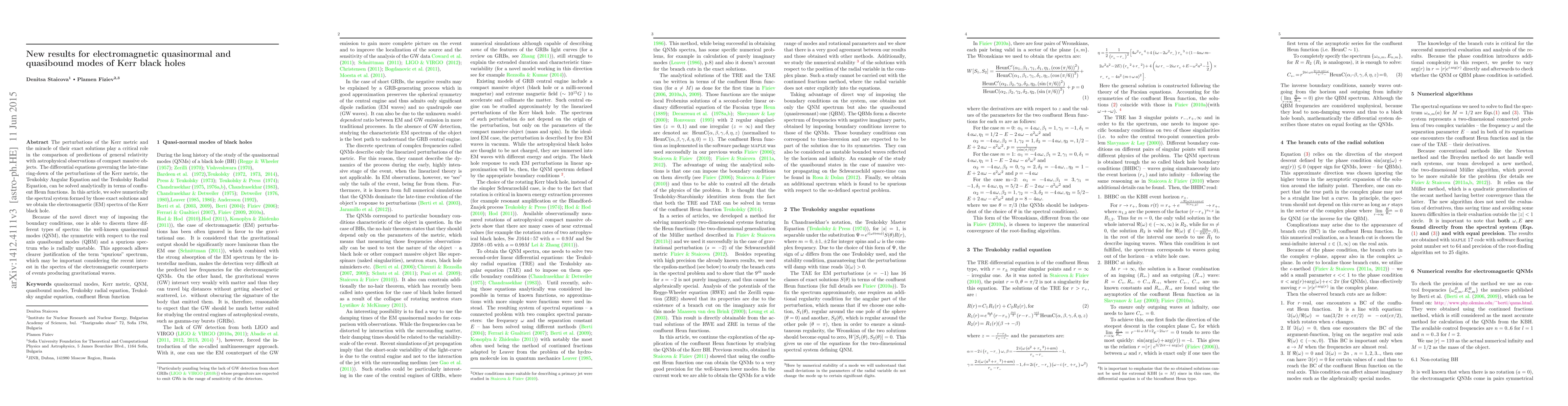 The perturbations of the Kerr metric and the miracle of their exact solutions play a critical role in the comparison of predictions of general relativity with astrophysical observations of compact massive objects. The differential equations governing the late-time ring-down of the perturbations of the Kerr metric, the Teukolsky Angular Equation and the Teukolsky Radial Equation, can be solved analytically in terms of confluent Heun functions. In this article, we solve numerically the spectral system formed by those exact solutions and we obtain the electromagnetic (EM) spectra of the Kerr black hole. Because of the novel direct way of imposing the boundary conditions, one is able to discern three different types of spectra: the well-known quasinormal modes (QNM), the symmetric with respect to the real axis quasibound modes (QBM) and a spurious spectrum who is radially unstable. This approach allows clearer justification of the term "spurious" spectrum, which may be important considering the recent interest in the spectra of the electromagnetic counterparts of events producing gravitational waves.
