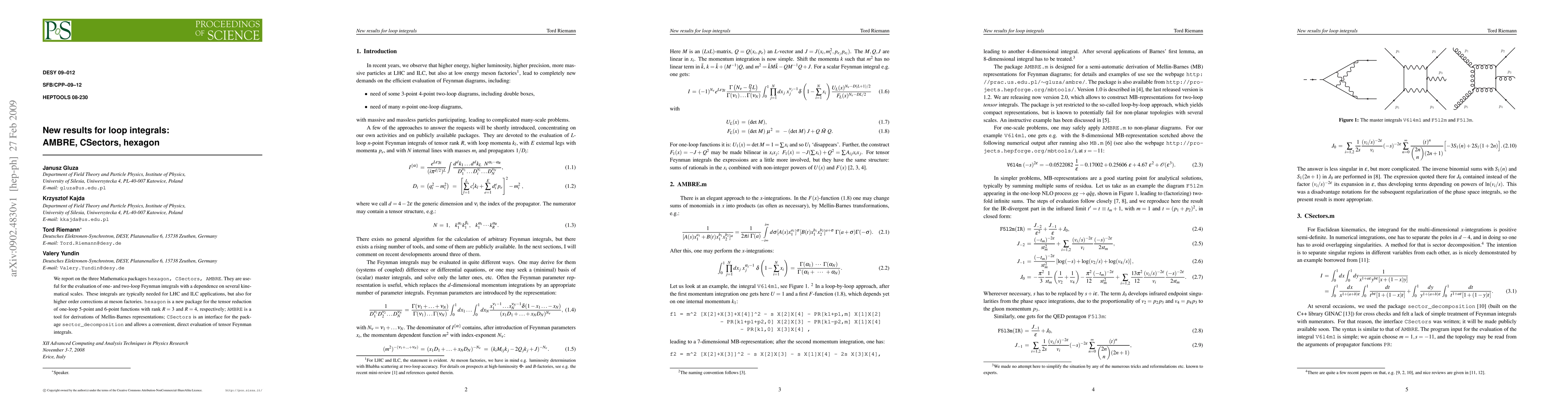 We report on the three Mathematica packages hexagon, CSectors, AMBRE. They are useful for the evaluation of one- and two-loop Feynman integrals with a dependence on several kinematical scales. These integrals are typically needed for LHC and ILC applications, but also for higher order corrections at meson factories. hexagon is a new package for the tensor reduction of one-loop 5-point and 6-point functions with rank R=3 and R=4, respectively; AMBRE is a tool for derivations of Mellin-Barnes representations; CSectors is an interface for the package sector_decomposition and allows a convenient, direct evaluation of tensor Feynman integrals.