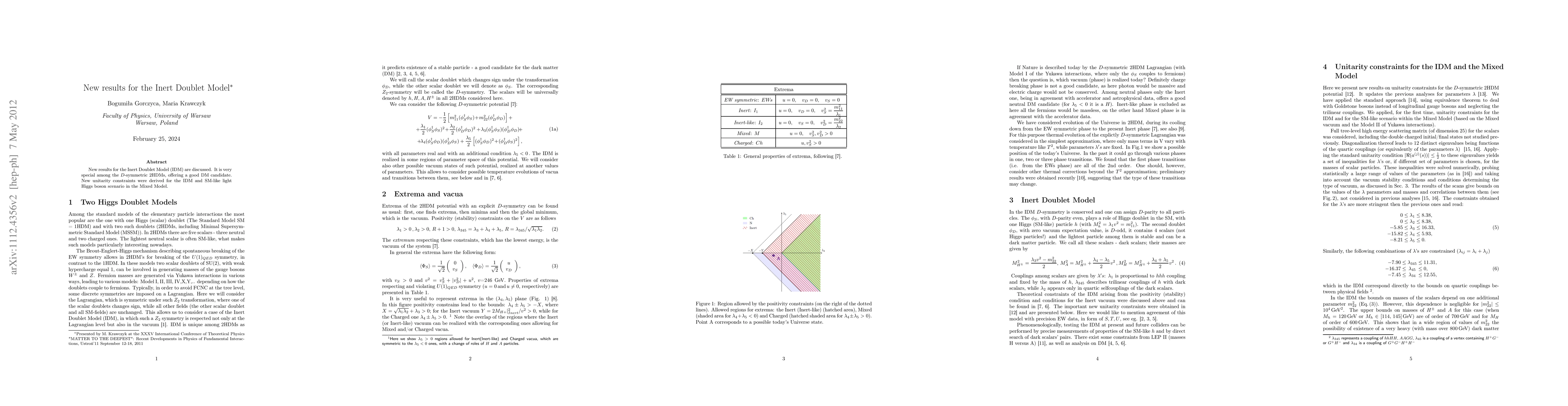 New results for the Inert Doublet Model (IDM) are discussed. It is very special among the $D$-symmetric 2HDMs, offering a good DM candidate. New unitarity constraints were derived for the IDM and SM-like light Higgs boson scenario in the Mixed Model.