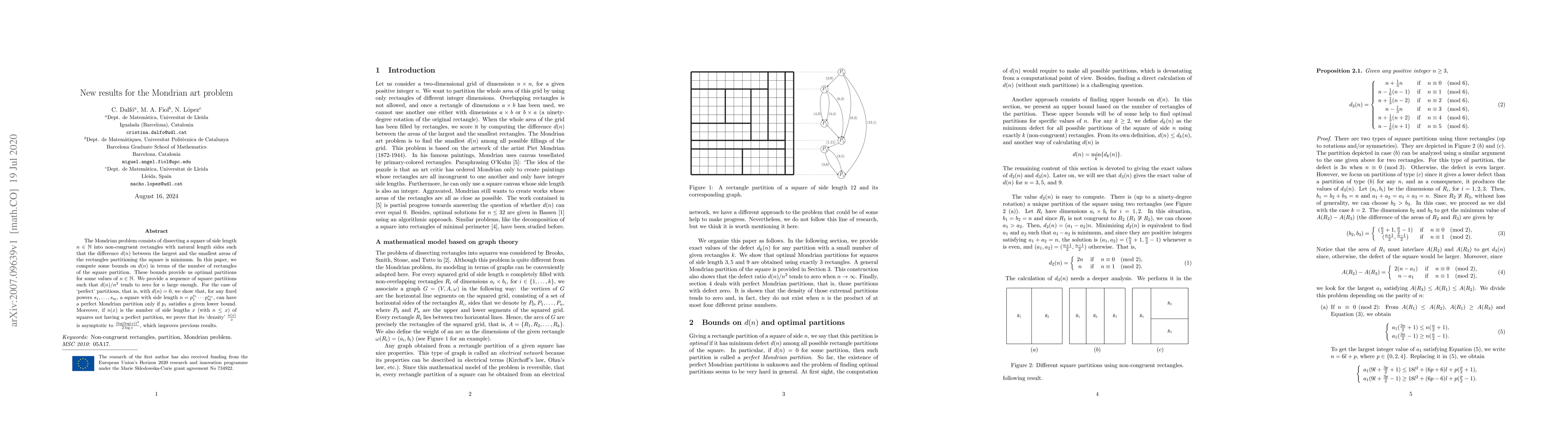 The Mondrian problem consists of dissecting a square of side length $n\in \NN$ into non-congruent rectangles with natural length sides such that the difference $d(n)$ between the largest and the smallest areas of the rectangles partitioning the square is minimum. In this paper, we compute some bounds on $d(n)$ in terms of the number of rectangles of the square partition. These bounds provide us optimal partitions for some values of $n \in \NN$. We provide a sequence of square partitions such that $d(n)/n^2$ tends to zero for $n$ large enough. For the case of `perfect' partitions, that is, with $d(n)=0$, we show that, for any fixed powers $s_1,\ldots, s_m$, a square with side length $n=p_1^{s_1}\cdots p_m^{s_m}$, can have a perfect Mondrian partition only if $p_1$ satisfies a given lower bound. Moreover, if $n(x)$ is the number of side lengths $x$ (with $n\le x$) of squares not having a perfect partition, we prove that its `density' $\frac{n(x)}{x}$ is asymptotic to $\frac{(\log(\log(x))^2}{2\log x}$, which improves previous results.