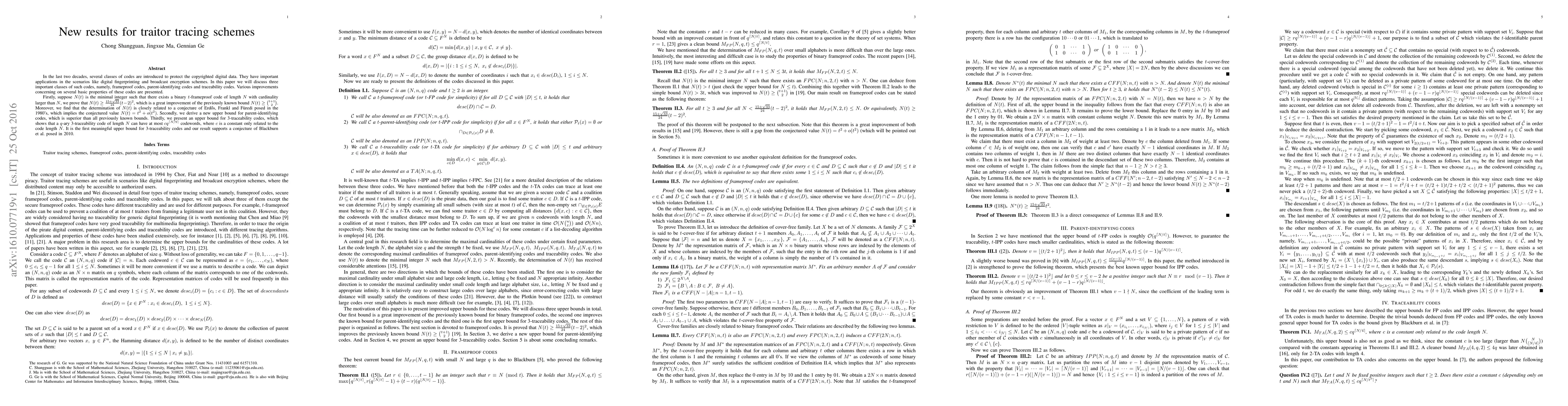 This paper presents new results for traitor tracing schemes, improving bounds on frameproof codes, establishing a superior upper bound for parent-identifying codes, and providing the first meaningful upper bound for 3-traceability codes, supporting a conjecture from 2010.