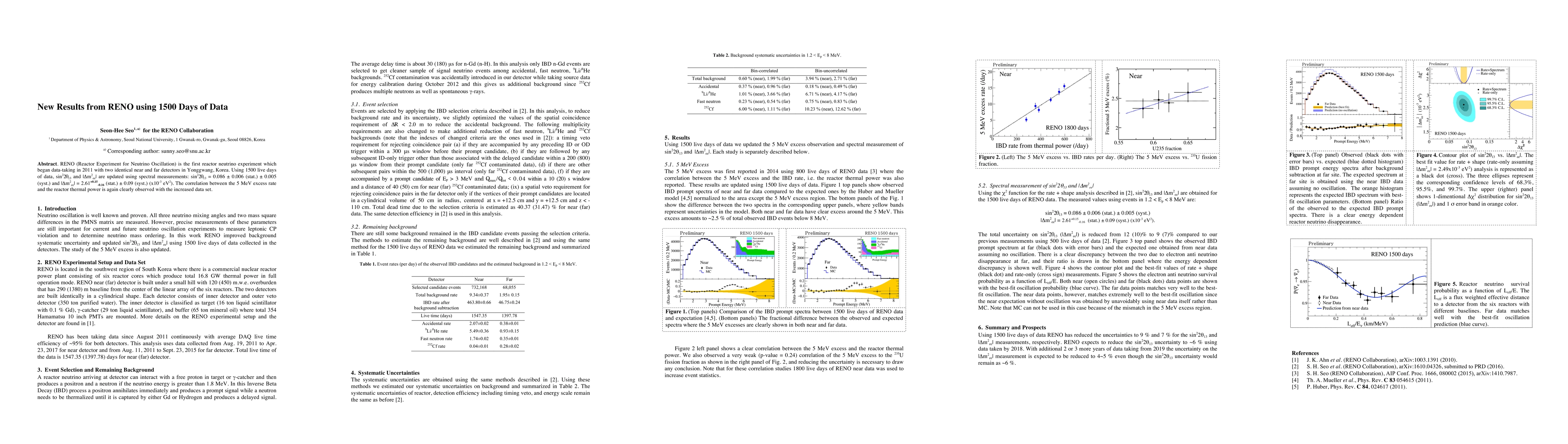 RENO (Reactor Experiment for Neutrino Oscillation) is the first reactor neutrino experiment which began data-taking in 2011 with two identical near and far detectors in Yonggwang, Korea. Using 1500 live days of data, sin^2(2{\theta}_13) and |{\Delta}m^2_ee| are updated using spectral measurements: sin^2(2{\theta}_13) = 0.086 +/- 0.006 (stat.) +/- 0.005 (syst.) and |{\Delta}m^2_ee| = 2.61+0.15-0.16 (stat.) +/- 0.09 (syst.) (x10^-3 eV^2). The correlation between the 5 MeV excess rate and the reactor thermal power is again clearly observed with the increased data set.