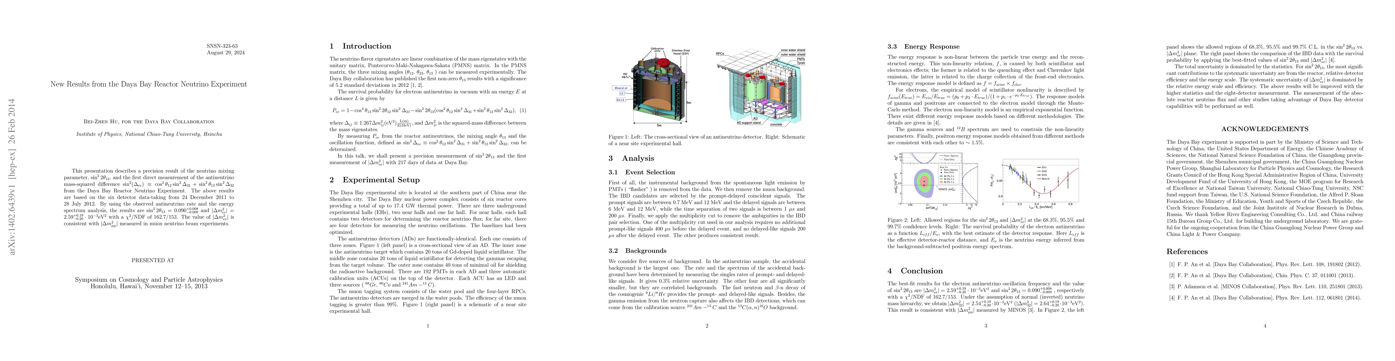 This presentation describes a precision result of the neutrino mixing parameter, $\sin^2 2\theta_{13}$, and the first direct measurement of the antineutrino mass-squared difference $\sin^2(\Delta_{ee}) \equiv \cos^2 \theta_{12} \sin^2 \Delta_{31} + \sin^2 \theta_{12} \sin^2 \Delta_{32}$ from the Daya Bay Reactor Neutrino Experiment. The above results are based on the six detector data-taking from 24 December 2011 to 28 July 2012. By using the observed antineutrino rate and the energy spectrum analysis, the results are $\sin^2 2\theta_{13}=0.090^{+0.008}_{-0.009}$ and $| \Delta m^2_{ee}| = 2.59^{+0.19}_{-0.20} \cdot 10^{-3} $eV$^2$ with a $\chi^2$/NDF of 162.7/153. The value of $| \Delta m^2_{ee}| $ is consistent with $| \Delta m^2_{\mu\mu}|$ measured in muon neutrino beam experiments.