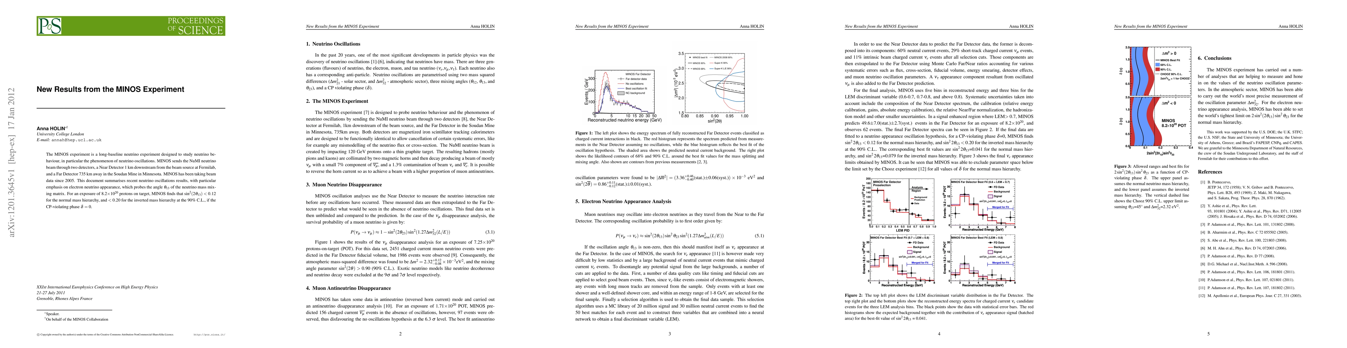 The MINOS experiment is a long-baseline neutrino experiment designed to study neutrino behaviour, in particular the phenomenon of neutrino oscillations. MINOS sends the NuMI neutrino beam through two detectors, a Near Detector 1 km downstream from the beam source at Fermilab, and a Far Detector 735 km away in the Soudan Mine in Minnesota. MINOS has been taking beam data since 2005. This document summarises recent neutrino oscillations results, with particular emphasis on electron neutrino appearance, which probes the angle $\theta_{13}$ of the neutrino mass mixing matrix. For an exposure of 8.2$\times 10^{20}$ protons on target, MINOS finds that $\sin^{2}(2\theta_{13})<0.12$ for the normal mass hierarchy, and $<0.20$ for the inverted mass hierarchy at the 90% C.L., if the CP-violating phase $\delta=0$.
