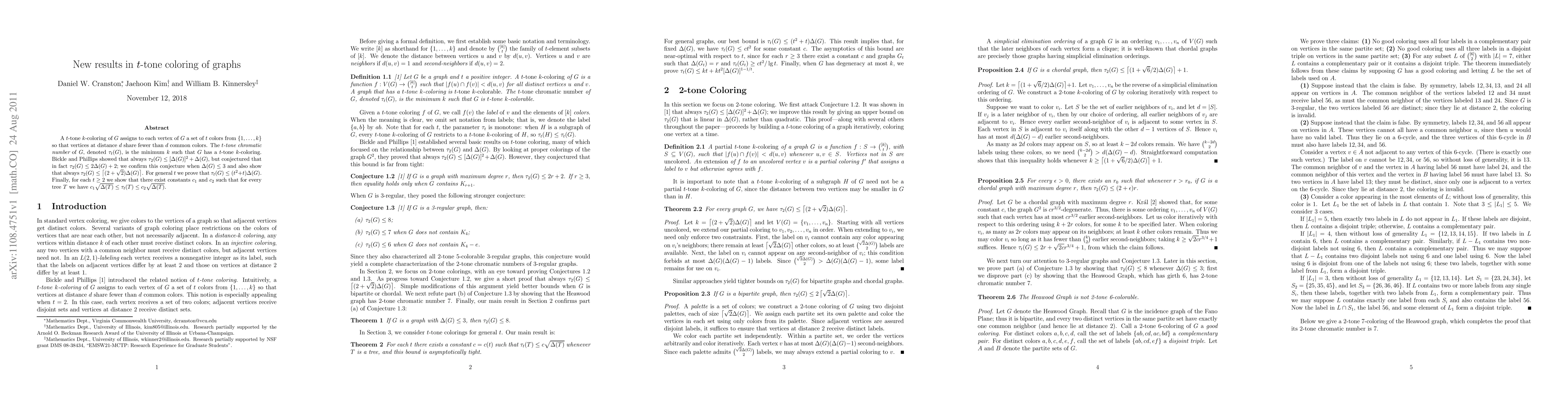 A $t$-tone $k$-coloring of $G$ assigns to each vertex of $G$ a set of $t$ colors from $\{1,..., k\}$ so that vertices at distance $d$ share fewer than $d$ common colors. The {\it $t$-tone chromatic number} of $G$, denoted $\tau_t(G)$, is the minimum $k$ such that $G$ has a $t$-tone $k$-coloring. Bickle and Phillips showed that always $\tau_2(G) \le [\Delta(G)]^2 + \Delta(G)$, but conjectured that in fact $\tau_2(G) \le 2\Delta(G) + 2$; we confirm this conjecture when $\Delta(G) \le 3$ and also show that always $\tau_2(G) \le \ceil{(2 + \sqrt{2})\Delta(G)}$. For general $t$ we prove that $\tau_t(G) \le (t^2+t)\Delta(G)$. Finally, for each $t\ge 2$ we show that there exist constants $c_1$ and $c_2$ such that for every tree $T$ we have $c_1 \sqrt{\Delta(T)} \le \tau_t(T) \le c_2\sqrt{\Delta(T)}$.