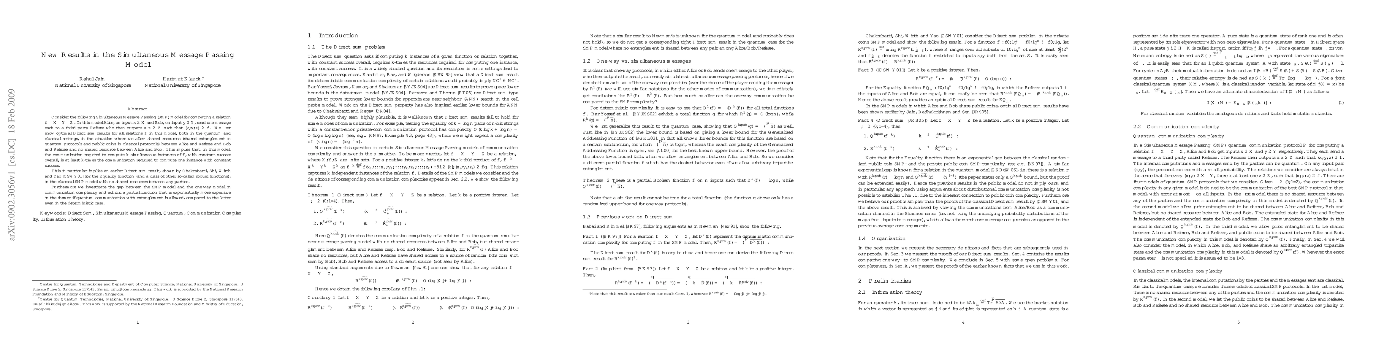This research presents optimal 'Direct Sum' results in the Simultaneous Message Passing (SMP) model for computing relations, both classically and quantumly, with shared resources. It also highlights a significant communication complexity gap between SMP and one-way models, demonstrating that certain functions are exponentially more costly in SMP with quantum communication and entanglement, compared to the deterministic one-way model.