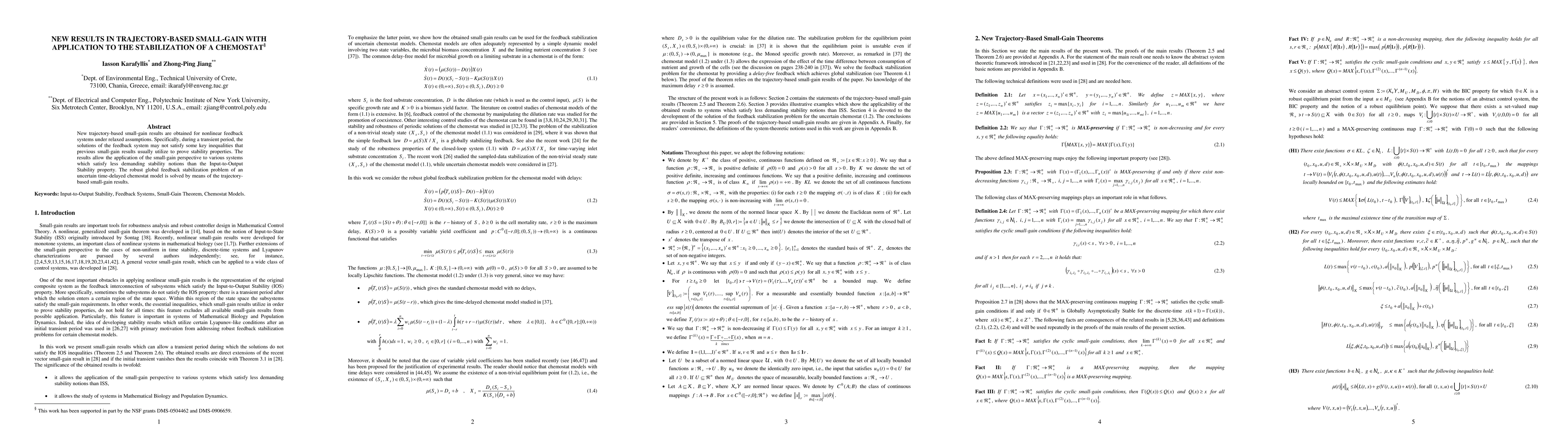 This paper presents new trajectory-based small-gain results for nonlinear feedback systems, relaxing previous assumptions. It applies these results to solve the robust global stabilization problem for an uncertain time-delayed chemostat model, even when traditional stability properties are not fully met.