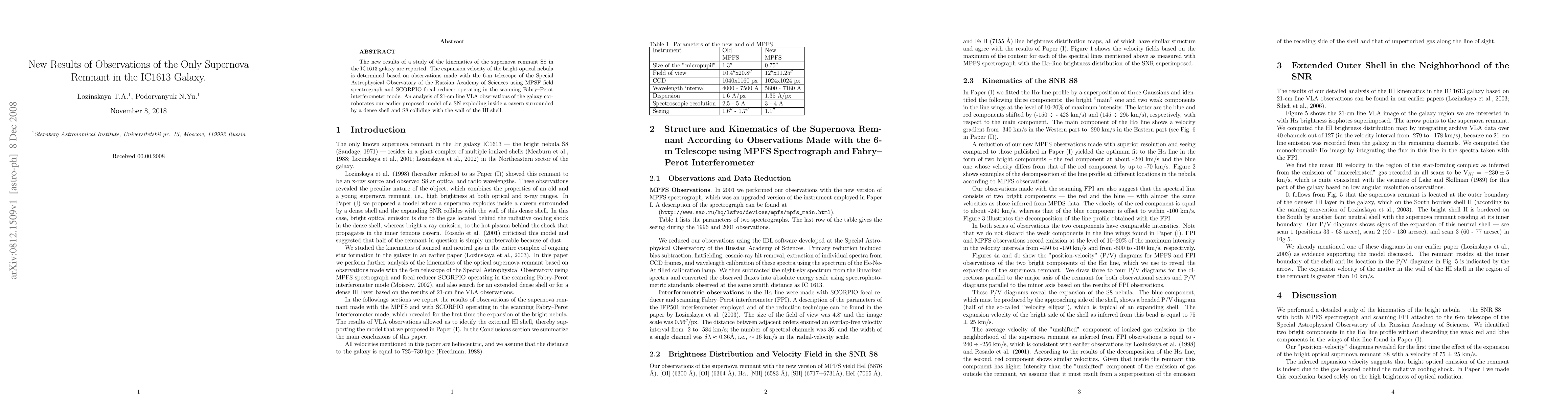 New study of supernova remnant S8 in IC1613 galaxy uses 6-m telescope observations to determine expansion velocity. 21-cm line VLA data supports a model of a supernova explosion within a dense shell, with S8 colliding with the HI shell wall.