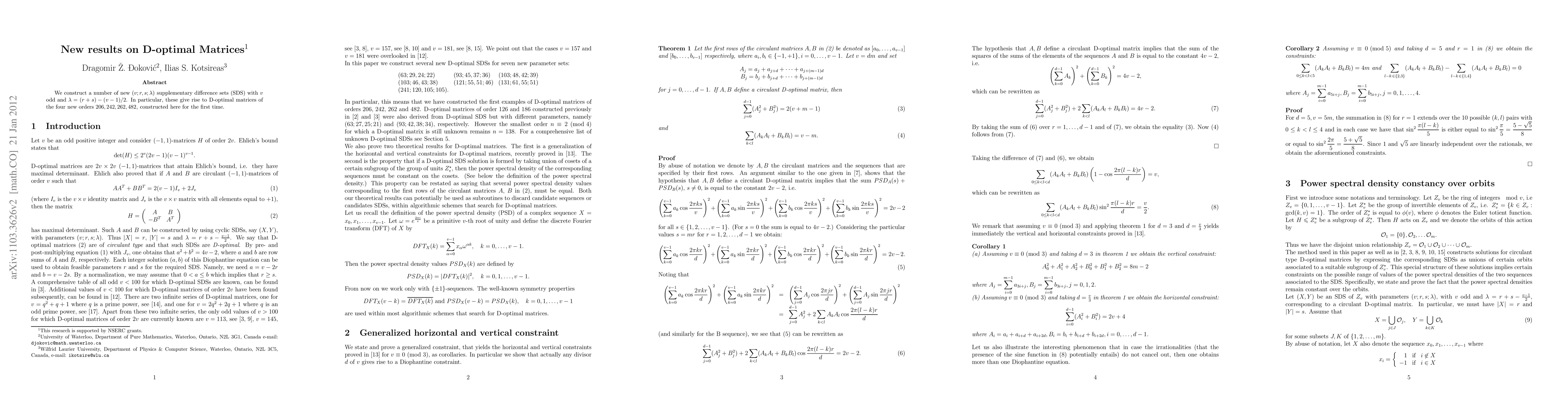 We construct a number of new (v;r,s;lambda) supplementary difference sets (SDS) with v odd and lambda = (r+s)-(v-1)/2. In particular, these give rise to D-optimal matrices of the four new orders 206, 242, 262, 482 constructed here for the first time.