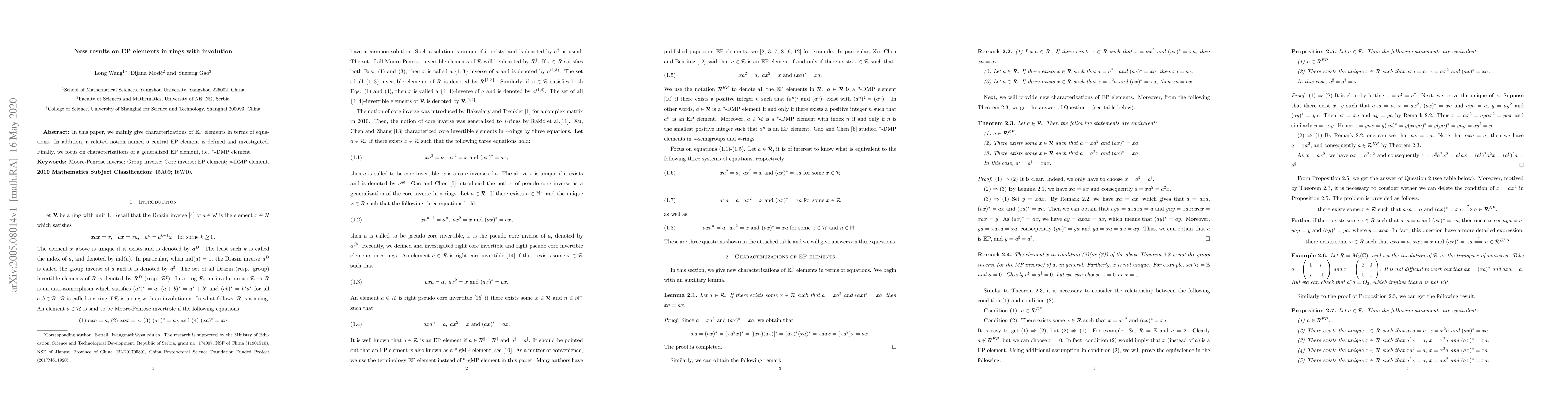 This paper characterizes EP elements in rings with involution through specific equations and introduces central EP elements, while also exploring the generalized *-DMP element. The study provides new insights into these algebraic structures.