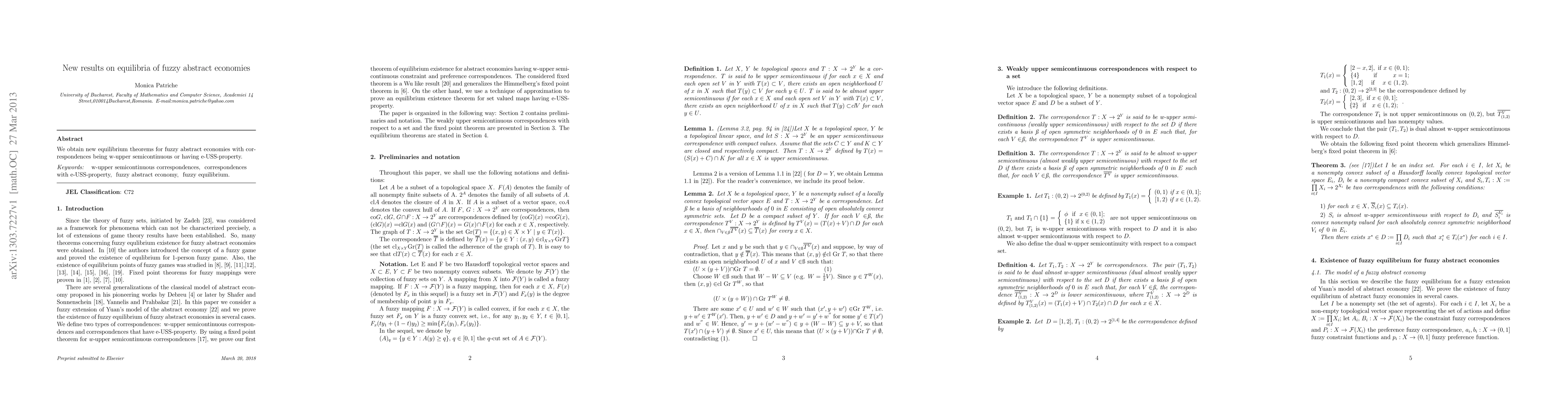 Summary: This paper presents novel equilibrium theorems for fuzzy abstract economies, focusing on correspondences that are either w-upper semicontinuous or possess the e-USS-property. These results advance the understanding of equilibrium conditions in fuzzy economic models.