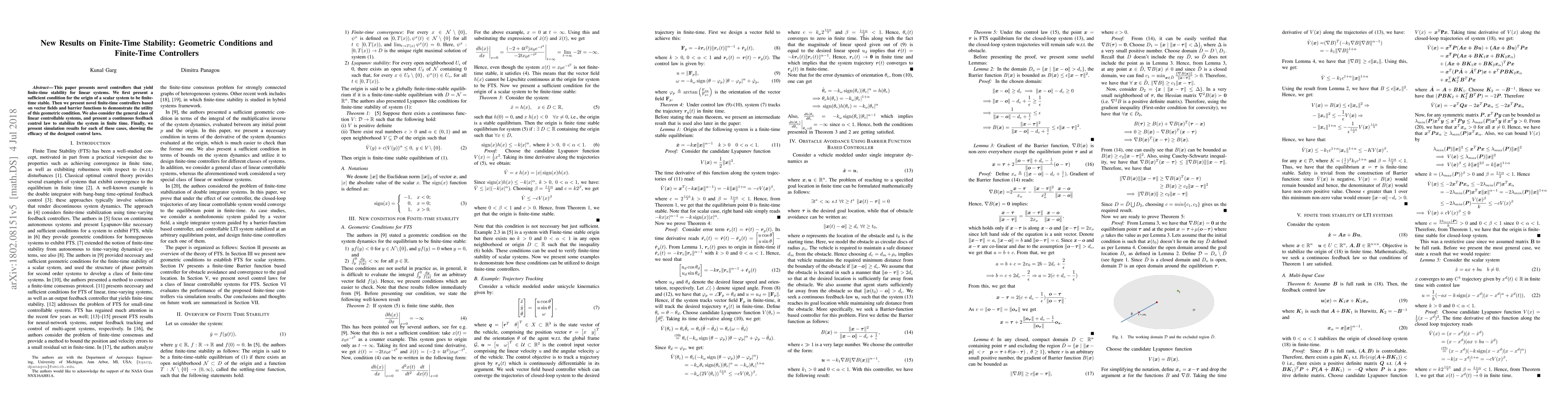 This paper presents novel controllers that yield finite-time stability for linear systems. We first present a sufficient condition for the origin of a scalar system to be finite-time stable. Then we present novel finite-time controllers based on vector fields and barrier functions to demonstrate the utility of this geometric condition. We also consider the general class of linear controllable systems, and present a continuous feedback control law to stabilize the system in finite time. Finally, we present simulation results for each of these cases, showing the efficacy of the designed control laws.