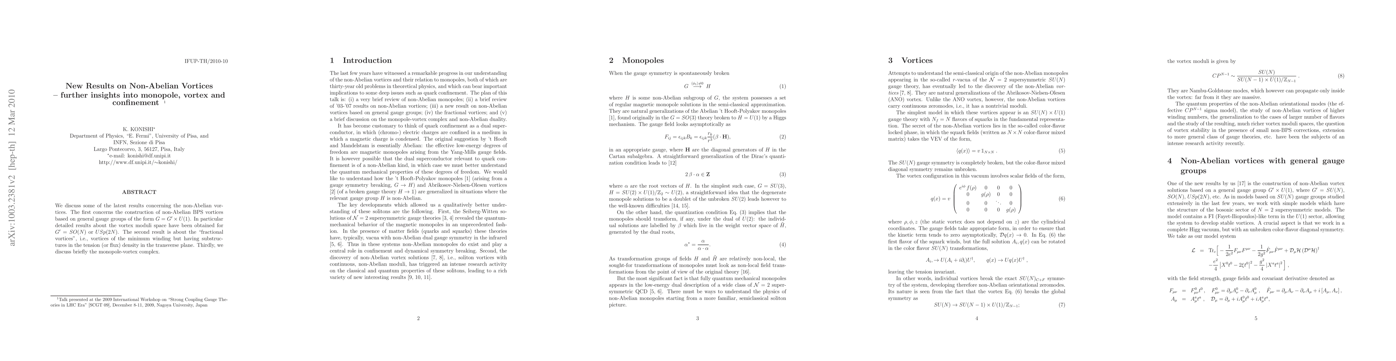 Researchers discuss new results on non-Abelian vortices, including detailed moduli spaces for specific gauge groups and insights into fractional vortices and the monopole-vortex complex.