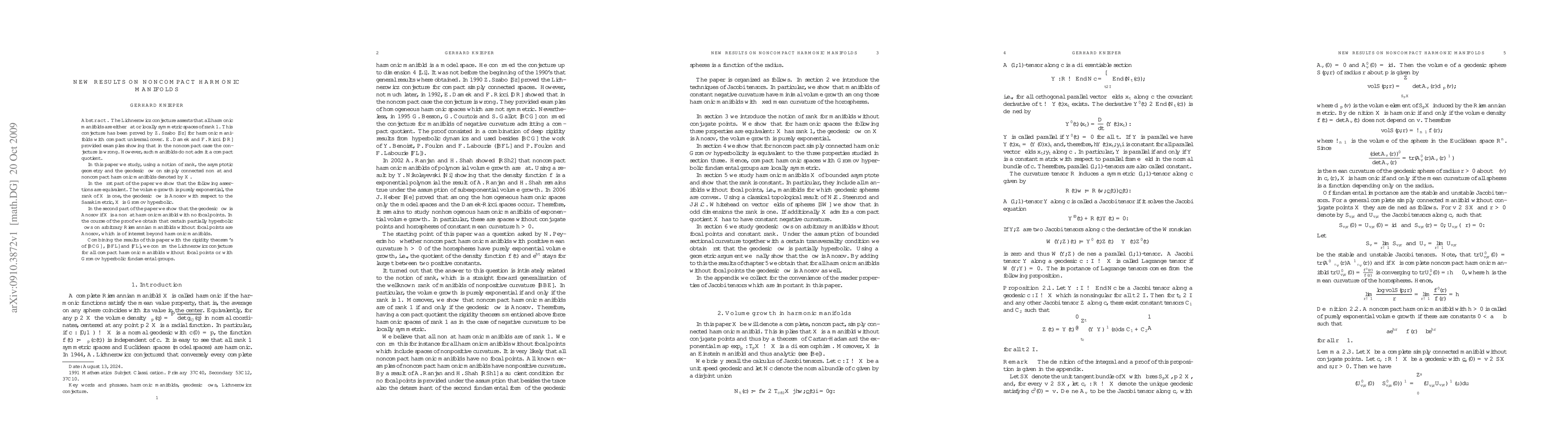 This paper investigates the asymptotic geometry and geodesic flow on noncompact, nonflat harmonic manifolds, confirming the Lichnerowicz conjecture for compact harmonic manifolds. It establishes equivalences among exponential volume growth, rank one, Anosov geodesic flow, and Gromov hyperbolicity for noncompact manifolds, and proves Anosov behavior for nonflat manifolds without focal points.