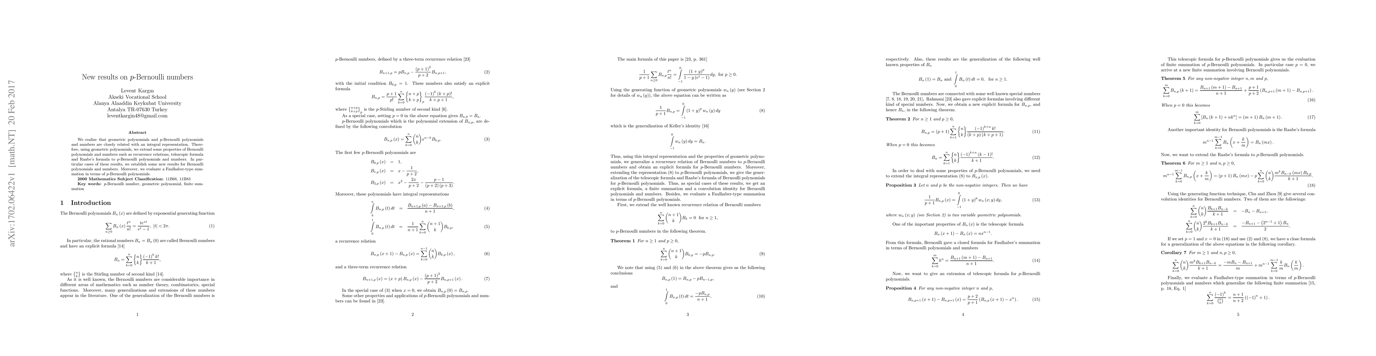 We realize that geometric polynomials and p-Bernoulli polynomials and numbers are closely related with an integral representation. Therefore, using geometric polynomials, we extend some properties of Bernoulli polynomials and numbers such as recurrence relations, telescopic formula and Raabe's formula to p-Bernoulli polynomials and numbers. In particular cases of these results, we establish some new results for Bernoulli polynomials and numbers. Moreover, we evaluate a Faulhaber-type summation in terms of p-Bernoulli polynomials.