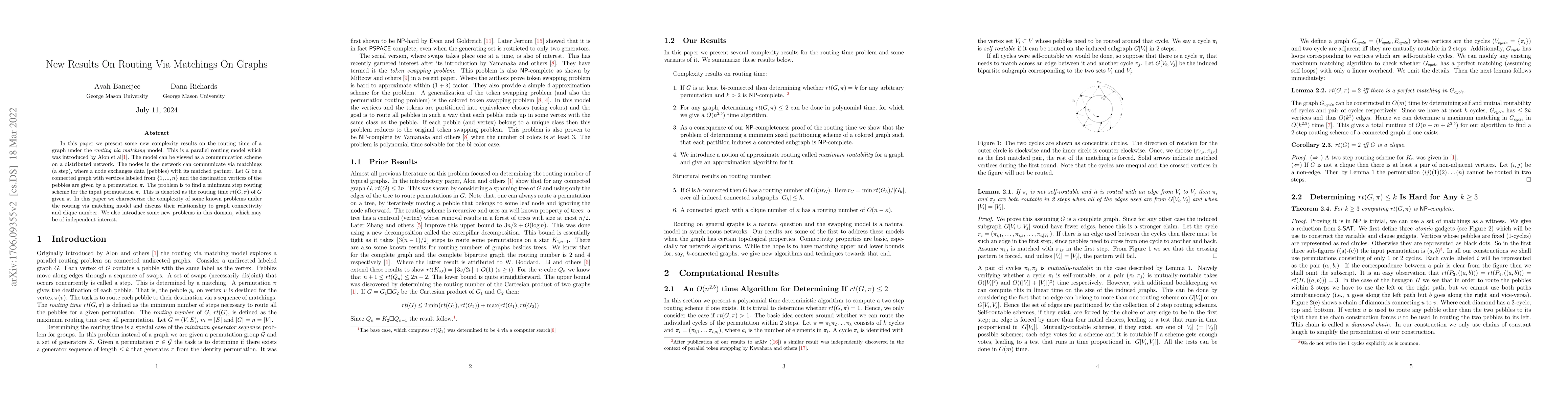 In this paper we present some new complexity results on the routing time of a graph under the \textit{routing via matching} model. This is a parallel routing model which was introduced by Alon et al\cite{alon1994routing}. The model can be viewed as a communication scheme on a distributed network. The nodes in the network can communicate via matchings (a step), where a node exchanges data (pebbles) with its matched partner. Let $G$ be a connected graph with vertices labeled from $\{1,...,n\}$ and the destination vertices of the pebbles are given by a permutation $\pi$. The problem is to find a minimum step routing scheme for the input permutation $\pi$. This is denoted as the routing time $rt(G,\pi)$ of $G$ given $\pi$. In this paper we characterize the complexity of some known problems under the routing via matching model and discuss their relationship to graph connectivity and clique number. We also introduce some new problems in this domain, which may be of independent interest.