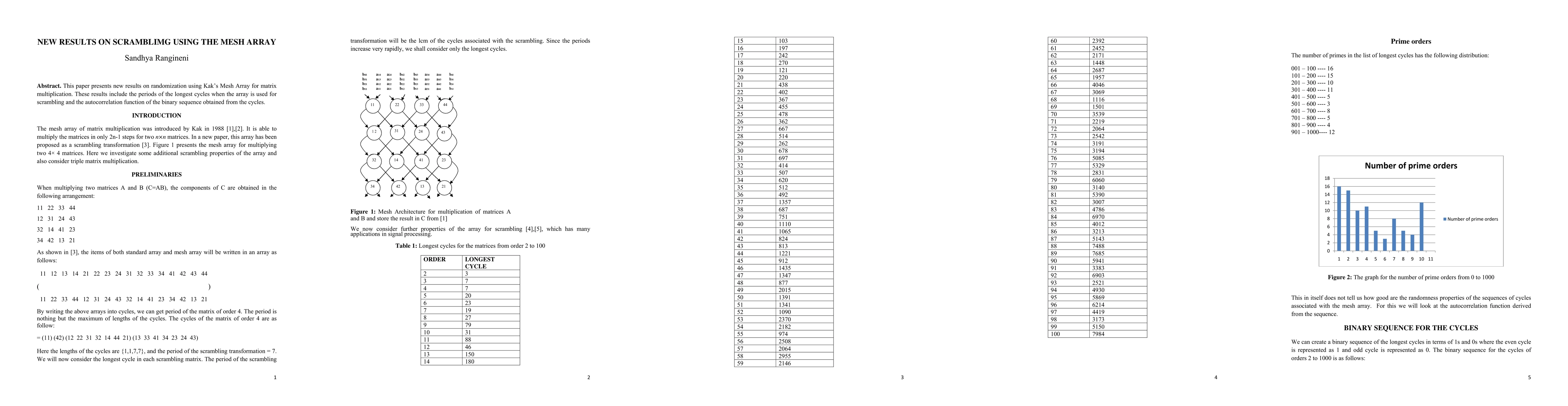This paper presents new results on randomization using Kak's Mesh Array for matrix multiplication. These results include the periods of the longest cycles when the the array is used for scrambling and the autocorrelation function of the binary sequence obtained from the cycles.
