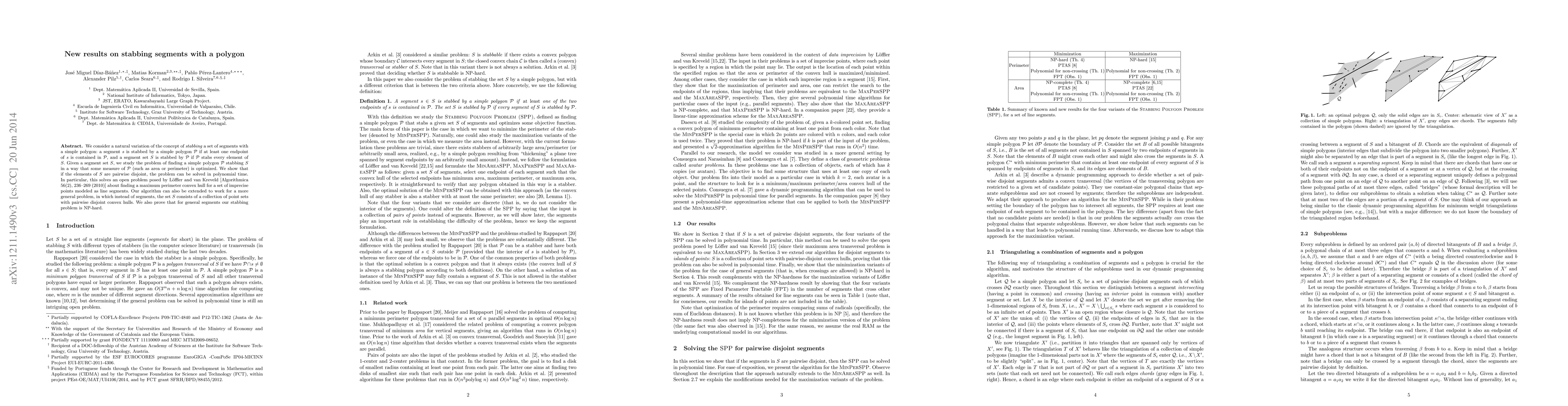 This paper explores the problem of finding the minimum perimeter polygon that can stab a set of pairwise disjoint segments, demonstrating a polynomial-time solution for this case. It also proves the NP-hardness for general segments and provides a solution to an open problem regarding the maximum perimeter convex hull for imprecise points modeled as line segments.