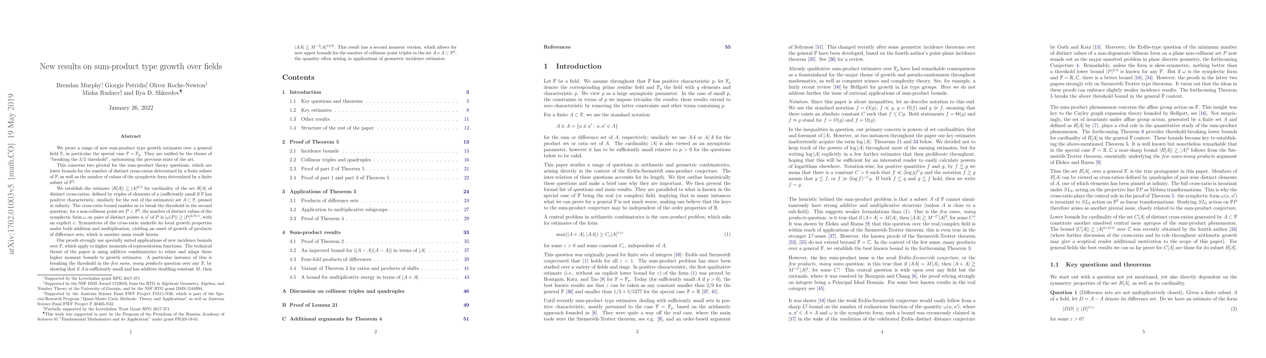 We prove a range of new sum-product type growth estimates over a general field $\mathbb{F}$, in particular the special case $\mathbb{F}=\mathbb{F}_p$. They are unified by the theme of "breaking the $3/2$ threshold", epitomising the previous state of the art. These estimates stem from specially suited applications of incidence bounds over $\mathbb{F}$, which apply to higher moments of representation functions. We establish the estimate $|R[A]| \gtrsim |A|^{8/5}$ for cardinality of the set $R[A]$ of distinct cross-ratios defined by triples of elements of a (sufficiently small if $\mathbb{F}$ has positive characteristic, similarly for the rest of the estimates) set $A\subset \mathbb{F}$, pinned at infinity. The cross-ratio naturally arises in various sum-product type questions of projective nature and is the unifying concept underlying most of our results. It enables one to take advantage of its symmetry properties as an onset of growth of, for instance, products of difference sets. The geometric nature of the cross-ratio enables us to break the version of the above threshold for the minimum number of distinct triangle areas $Ouu'$, defined by points $u,u'$ of a non-collinear point set $P\subset \mathbb{F}^2$. Another instance of breaking the threshold is showing that if $A$ is sufficiently small and has additive doubling constant $M$, then $|AA|\gtrsim M^{-2}|A|^{14/9}$. This result has a second moment version, which allows for new upper bounds for the number of collinear point triples in the set $A\times A\subset \mathbb{F}^2$, the quantity often arising in applications of geometric incidence estimates.