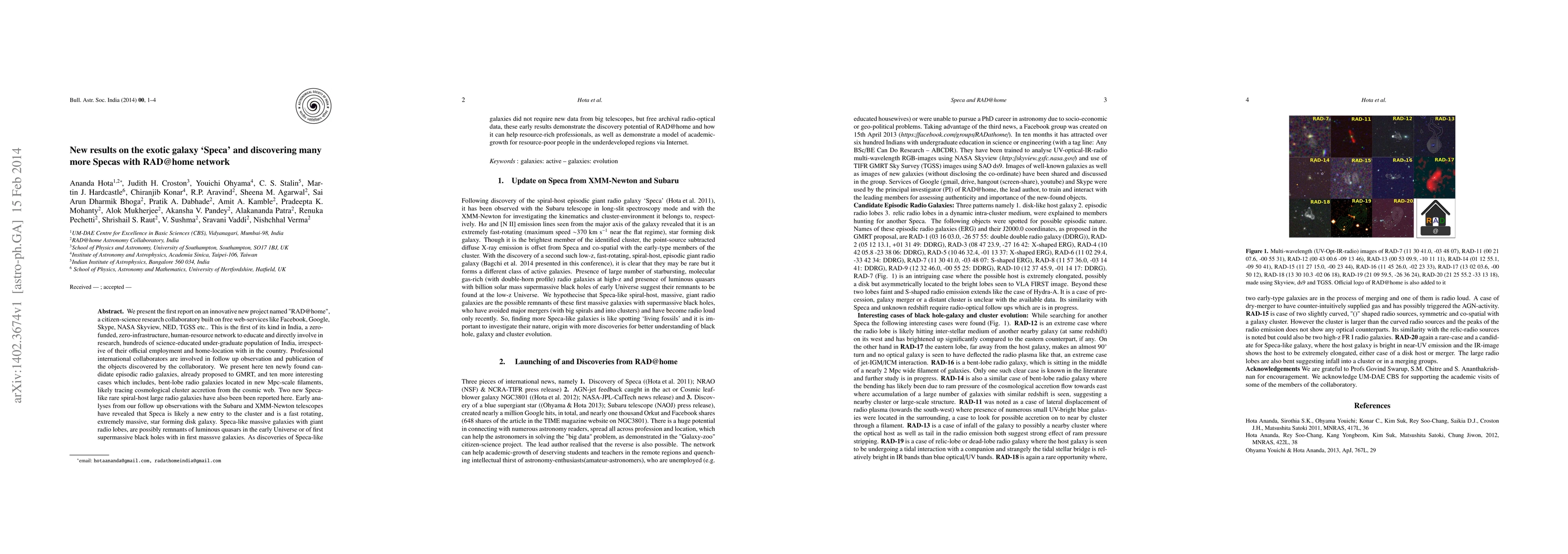 We present the first report on an innovative new project named "RAD@home", a citizen-science research collaboratory built on free web-services like Facebook, Google, Skype, NASA Skyview, NED, TGSS etc.. This is the first of its kind in India, a zero-funded, zero-infrastructure, human-resource network to educate and directly involve in research, hundreds of science-educated under-graduate population of India, irrespective of their official employment and home-location with in the country. Professional international collaborators are involved in follow up observation and publication of the objects discovered by the collaboratory. We present here ten newly found candidate episodic radio galaxies, already proposed to GMRT, and ten more interesting cases which includes, bent-lobe radio galaxies located in new Mpc-scale filaments, likely tracing cosmological cluster accretion from the cosmic web. Two new Speca-like rare spiral-host large radio galaxies have also been been reported here. Early analyses from our follow up observations with the Subaru and XMM-Newton telescopes have revealed that Speca is likely a new entry to the cluster and is a fast rotating, extremely massive, star forming disk galaxy. Speca-like massive galaxies with giant radio lobes, are possibly remnants of luminous quasars in the early Universe or of first supermassive black holes with in first masssve galaxies. As discoveries of Speca-like galaxies did not require new data from big telescopes, but free archival radio-optical data, these early results demonstrate the discovery potential of RAD@home and how it can help resource-rich professionals, as well as demonstrate a model of academic-growth for resource-poor people in the underdeveloped regions via Internet.