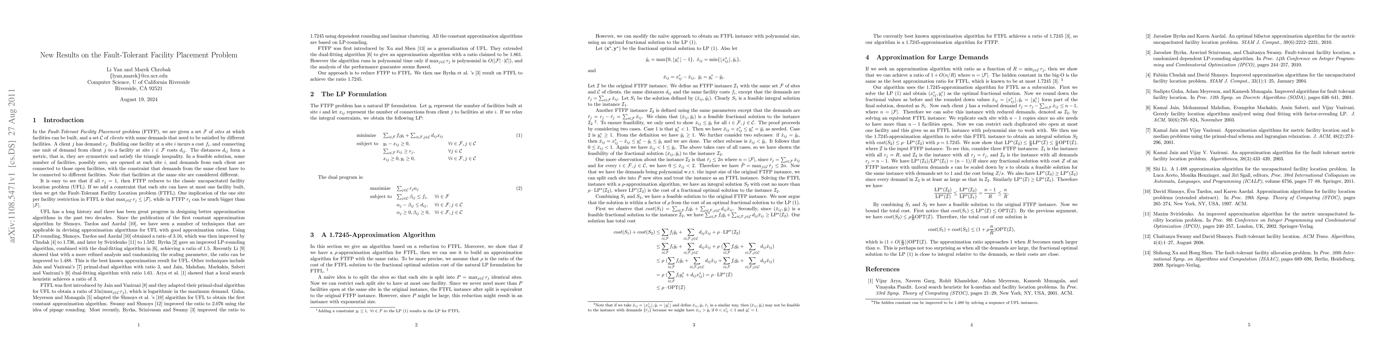 Researchers developed a 1.7245-approximation algorithm for the Fault-Tolerant Facility Placement Problem, which aims to minimize costs in facility placement while satisfying client demands.