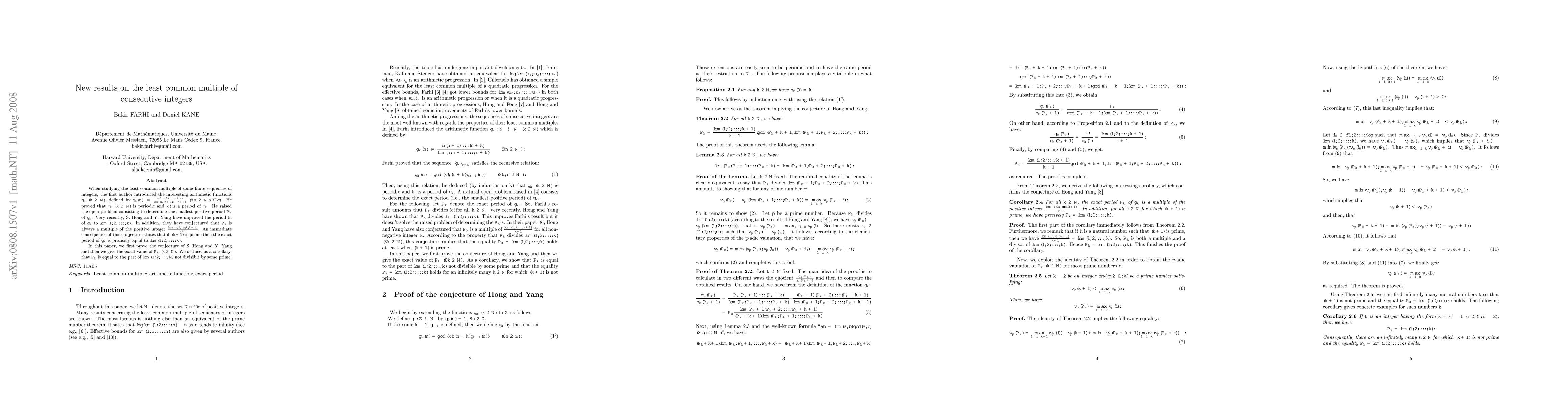 When studying the least common multiple of some finite sequences of integers, the first author introduced the interesting arithmetic functions $g_k$ $(k \in \mathbb{N})$, defined by $g_k(n) := \frac{n (n + 1) ... (n + k)}{\lcm(n, n + 1, >..., n + k)}$ $(\forall n \in \mathbb{N} \setminus \{0\})$. He proved that $g_k$ $(k \in \mathbb{N})$ is periodic and $k!$ is a period of $g_k$. He raised the open problem consisting to determine the smallest positive period $P_k$ of $g_k$. Very recently, S. Hong and Y. Yang have improved the period $k!$ of $g_k$ to $\lcm(1, 2, ..., k)$. In addition, they have conjectured that $P_k$ is always a multiple of the positive integer $\frac{\lcm(1, 2, >..., k, k + 1)}{k + 1}$. An immediate consequence of this conjecture states that if $(k + 1)$ is prime then the exact period of $g_k$ is precisely equal to $\lcm(1, 2, ..., k)$. In this paper, we first prove the conjecture of S. Hong and Y. Yang and then we give the exact value of $P_k$ $(k \in \mathbb{N})$. We deduce, as a corollary, that $P_k$ is equal to the part of $\lcm(1, 2, ..., k)$ not divisible by some prime.