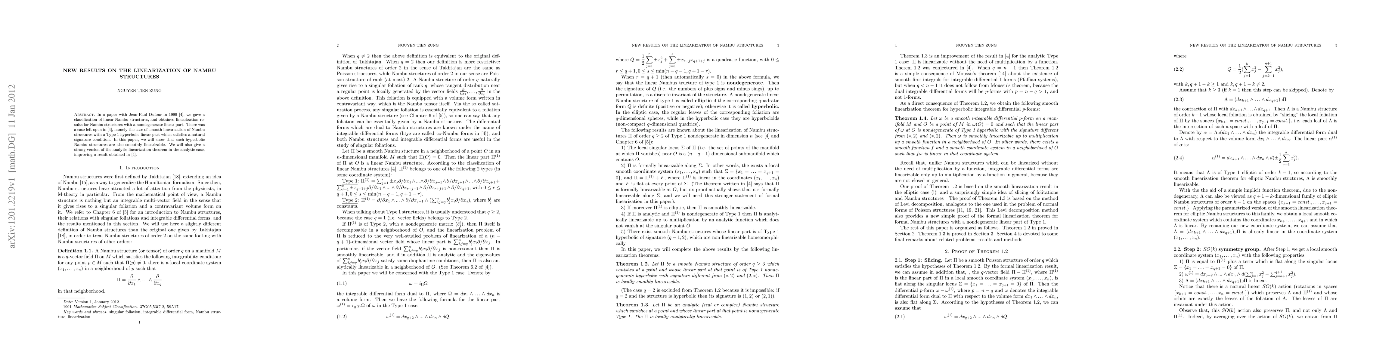 In a paper with Jean-Paul Dufour in 1999 \cite{DufourZung-Nambu1999}, we gave a classification of linear Nambu structures, and obtained linearization results for Nambu structures with a nondegenerate linear part. There was a case left open in \cite{DufourZung-Nambu1999}, namely the case of smooth linearization of Nambu structures with a Type 1 hyperbolic linear part which satisfies a natural signature condition. In this paper, we will show that such hyperbolic Nambu structures are also smoothly linearizable. We will also give a strong version of the analytic linearization theorem in the analytic case, improving a result obtained in \cite{DufourZung-Nambu1999}.