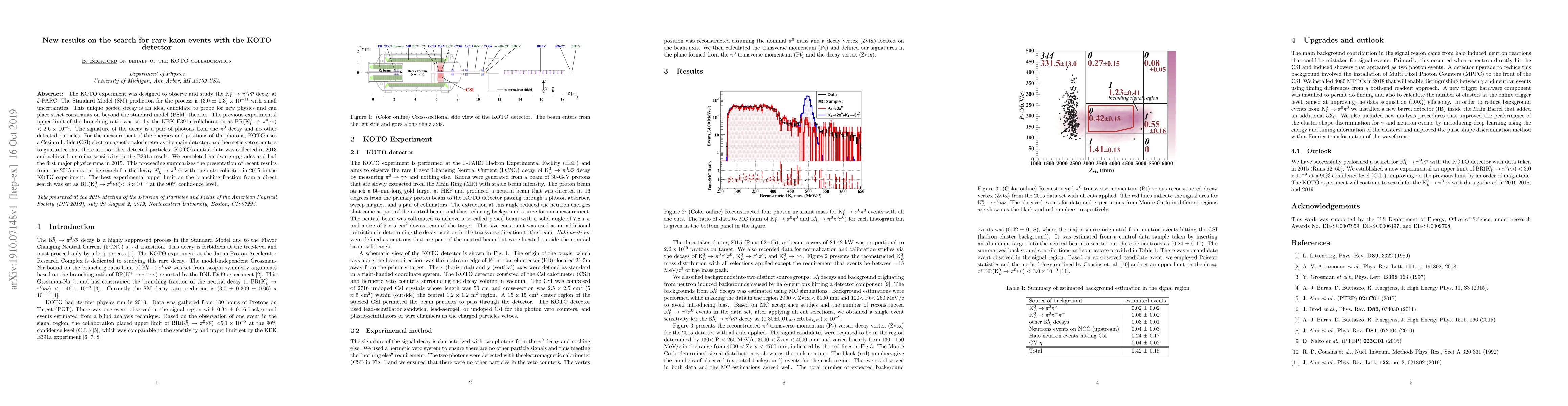 The KOTO experiment was designed to observe and study the K$^{0}_{L} \rightarrow$ $\pi^{0}\nu\bar{\nu}$ decay at J-PARC. The Standard Model (SM) prediction for the process is (3.0 $\pm$ 0.3) x 10$^{-11}$ with small uncertainties. This unique \emph{golden} decay is an ideal candidate to probe for new physics and can place strict constraints on beyond the standard model (BSM) theories. The previous experimental upper limit of the branching ratio was set by the KEK E391a collaboration as BR(K$^{0}_{L} \rightarrow \pi^{0}\nu\bar{\nu}$) $<$ 2.6 x 10$^{-8}$. The signature of the decay is a pair of photons from the $\pi^{0}$ decay and no other detected particles. For the measurement of the energies and positions of the photons, KOTO uses a Cesium Iodide (CSI) electromagnetic calorimeter as the main detector, and hermetic veto counters to guarantee that there are no other detected particles. KOTO's initial data was collected in 2013 and achieved a similar sensitivity to the E391a result. We completed hardware upgrades and had the first major physics runs in 2015. This proceeding summarizes the presentation of recent results from the 2015 runs on the search for the decay K$^{0}_{L} \rightarrow \pi^{0}\nu\bar{\nu}$ with the data collected in 2015 in the KOTO experiment. The best experimental upper limit on the branching fraction from a direct search was set as BR(K$^{0}_{L} \rightarrow \pi^{0}\nu\bar{\nu}$)$<$ 3 x 10$^{-9}$ at the 90\% confidence level.