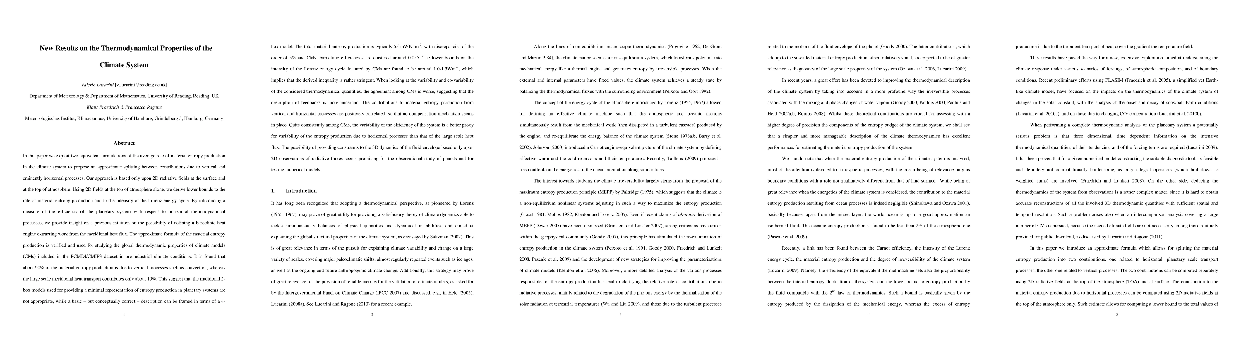 In this paper we exploit two equivalent formulations of the average rate of material entropy production in a planetary system to propose an approximate splitting between contributions due to vertical and eminently horizontal processes. Our approach is based only upon 2D radiative fields at the surface and at the top of atmosphere of a general planetary body. Using 2D fields at the top of atmosphere alone, we derive lower bounds to the rate of material entropy production and to the intensity of the Lorenz energy cycle. By introducing a measure of the efficiency of the planetary system with respect to horizontal thermodynamical processes, we provide insight on a previous intuition on the possibility of defining a baroclinic heat engine extracting work from the meridional heat flux. The approximate formula of the material entropy production is verified and used for studying the global thermodynamic properties of climate models (CMs) included in the PCMDI/CMIP3 dataset in pre-industrial climate conditions. It is found that about 90% of the material entropy production is due to vertical processes such as convection, whereas the large scale meridional heat transport contributes only about 10%. The total material entropy production is typically 55 mWK-1m-2, with discrepancies of the order of 5% and CMs' baroclinic efficiencies are clustered around 0.055. When looking at the variability and co-variability of the considered thermodynamical quantities, the agreement among CMs is worse, suggesting that the description of feedbacks is more uncertain.