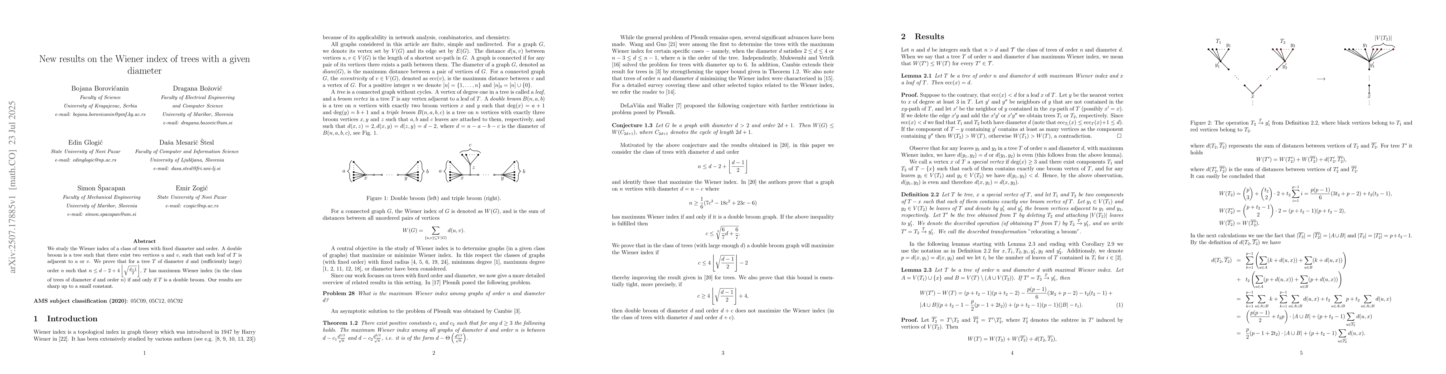 We study the Wiener index of a class of trees with fixed diameter and order. A double broom is a tree such that there exist two vertices $u$ and $v$, such that each leaf of $T$ is adjacent to $u$ or $v$. We prove that for a tree $T$ of diameter $d$ and (sufficiently large) order $n$ such that $n\leq d-2+4 \left\lfloor \sqrt{ \frac{d-1}{2}} \right\rfloor$, $T$ has maximum Wiener index (in the class of trees of diameter $d$ and order $n$) if and only if $T$ is a double broom. Our results are sharp up to a small constant.
