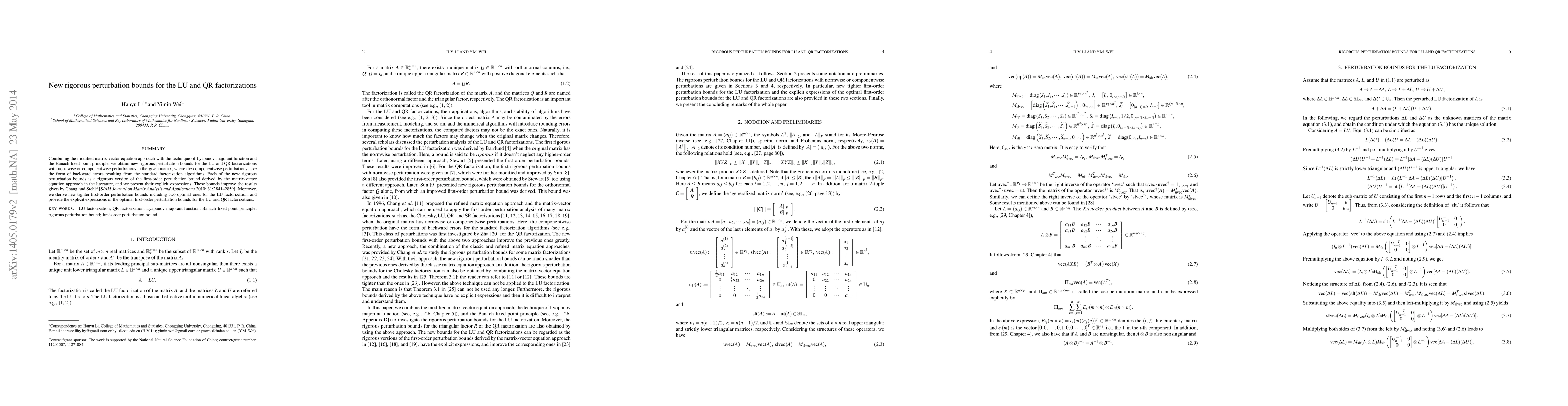This paper presents new rigorous perturbation bounds for LU and QR factorizations using advanced mathematical techniques, improving upon previous results by Chang and Stehl\'{e}. The new bounds include tighter first-order perturbation bounds, with explicit expressions provided for optimal bounds in both LU and QR factorizations.