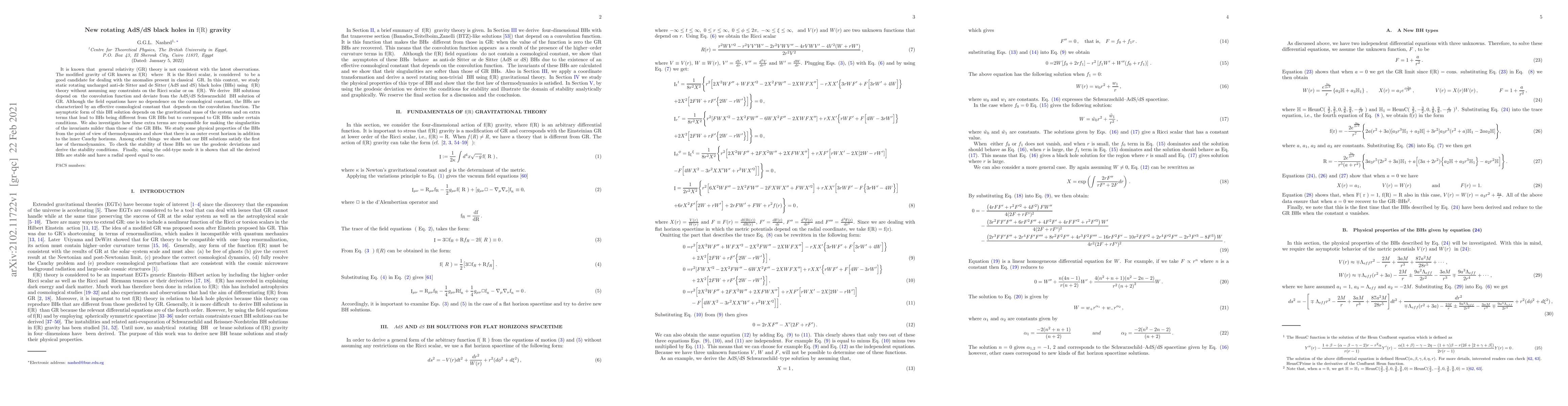 It is known that general relativity (GR) theory is not consistent with the latest observations. The modified gravity of GR known as $\mathrm{f(R)}$ where $\mathrm{R}$ is the Ricci scalar, is considered to be a good candidate for dealing with the anomalies present in classical GR. In this context, we study static rotating uncharged anti-de Sitter and de Sitter (AdS and dS) black holes (BHs) using $\mathrm{f(R)}$ theory without assuming any constraints on the Ricci scalar or on $\mathrm{f(R)}$. We derive BH solutions depend on the convolution function and deviate from the AdS/dS Schwarzschild BH solution of GR. Although the field equations have no dependence on the cosmological constant, the BHs are characterized by an effective cosmological constant that depends on the convolution function. The asymptotic form of this BH solution depends on the gravitational mass of the system and on extra terms that lead to BHs being different from GR BHs but to correspond to GR BHs under certain conditions. We also investigate how these extra terms are responsible for making the singularities of the invariants milder than those of the GR BHs. We study some physical properties of the BHs from the point of view of thermodynamics and show that there is an outer event horizon in addition to the inner Cauchy horizons. Among other things, we show that our BH solutions satisfy the first law of thermodynamics. To check the stability of these BHs we use the geodesic deviations and derive the stability conditions. Finally, using the odd-type mode it is shown that all the derived BHs are stable and have a radial speed equal to one.
