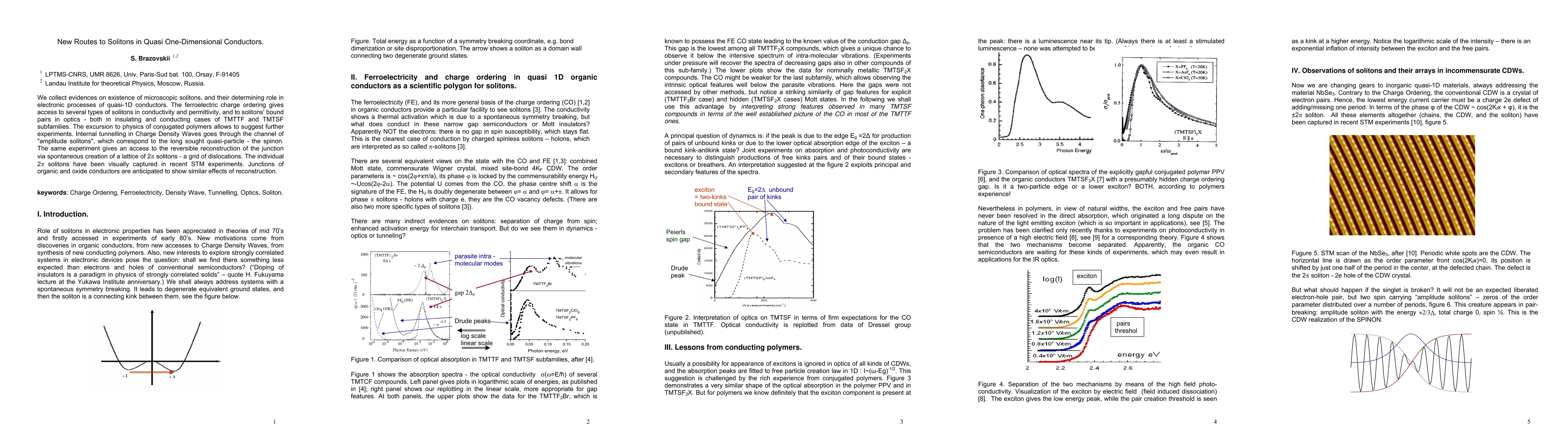 This paper explores the existence of microscopic solitons in quasi-one-dimensional conductors, emphasizing their role in electronic processes. It highlights ferroelectric charge ordering and its influence on solitons in conductivity, permittivity, and optics, particularly in TMTTF and TMTSF subfamilies, and suggests further experiments in conjugated polymers.