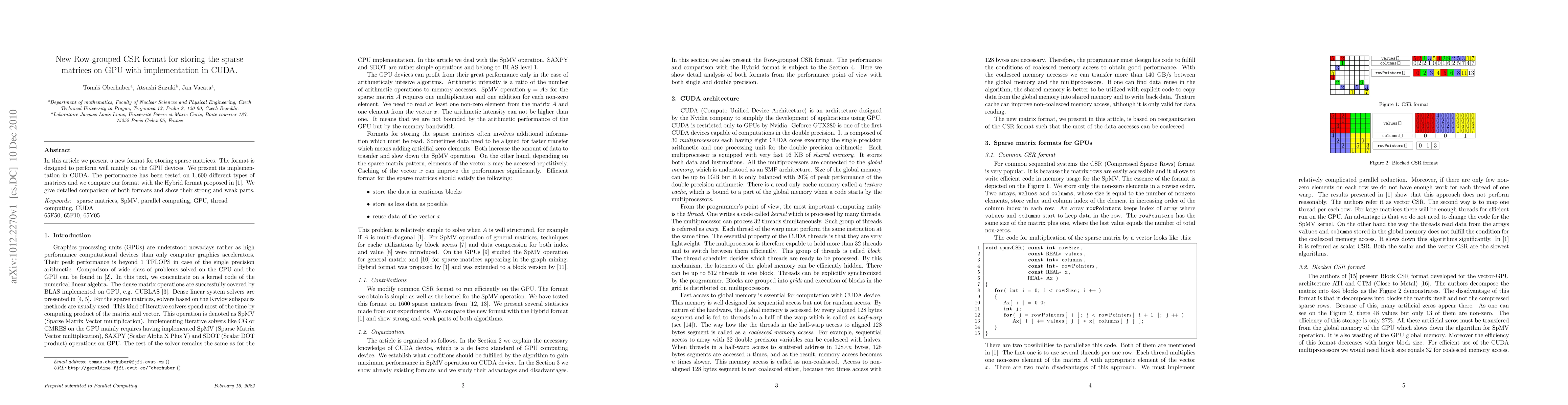 This paper introduces a new row-grouped Compressed Sparse Row (CSR) format optimized for GPU performance, implemented in CUDA. Performance tests on 1,600 matrix types reveal its advantages and disadvantages compared to the Hybrid format.