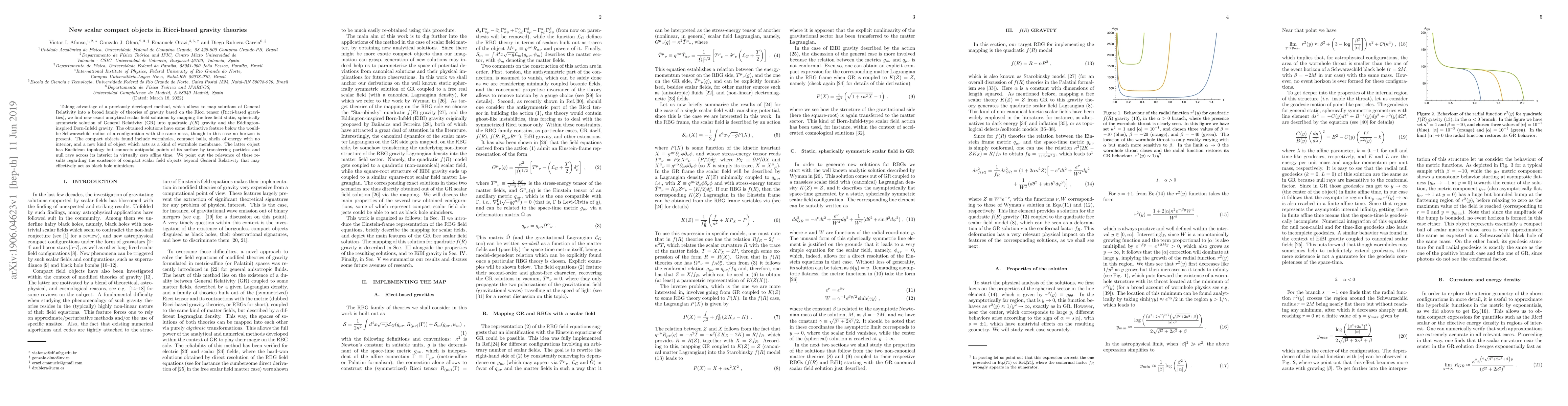 Taking advantage of a previously developed method, which allows to map solutions of General Relativity into a broad family of theories of gravity based on the Ricci tensor (Ricci-based gravities), we find new exact analytical scalar field solutions by mapping the free-field static, spherically symmetric solution of General Relativity (GR) into quadratic $f(R)$ gravity and the Eddington-inspired Born-Infeld gravity. The obtained solutions have some distinctive feature below the would-be Schwarzschild radius of a configuration with the same mass, though in this case no horizon is present. The compact objects found include wormholes, compact balls, shells of energy with no interior, and a new kind of object which acts as a kind of wormhole membrane. The latter object has Euclidean topology but connects antipodal points of its surface by transferring particles and null rays across its interior in virtually zero affine time. We point out the relevance of these results regarding the existence of compact scalar field objects beyond General Relativity that may effectively act as black hole mimickers.