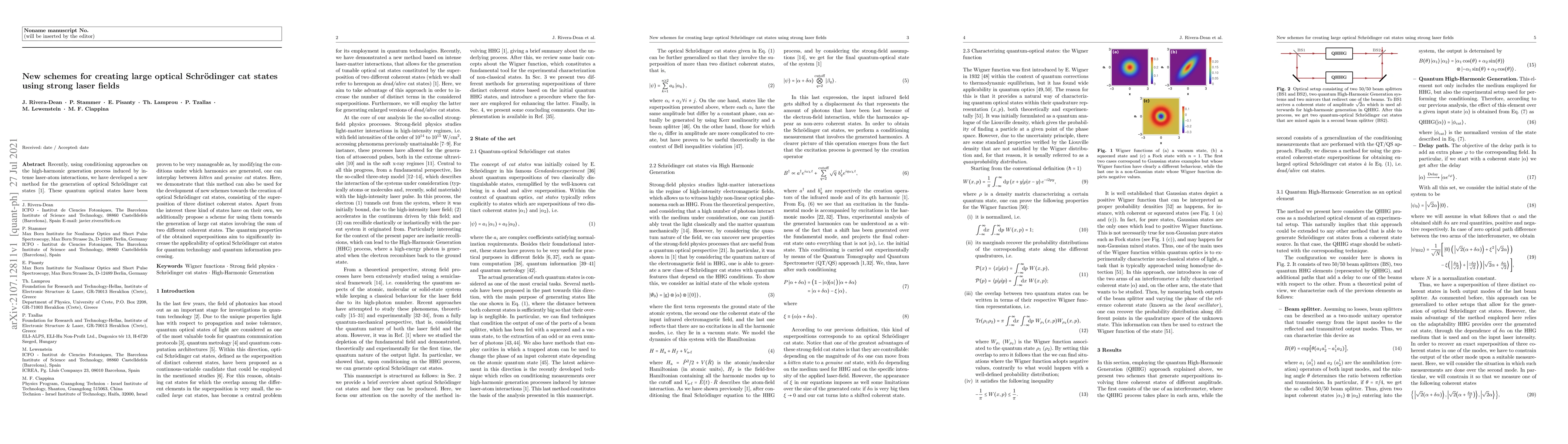 This paper introduces new methods for generating large optical Schrödinger cat states using intense laser fields, leveraging high-harmonic generation. The proposed schemes create superpositions of three or more coherent states, enhancing their potential for quantum technology and information processing.