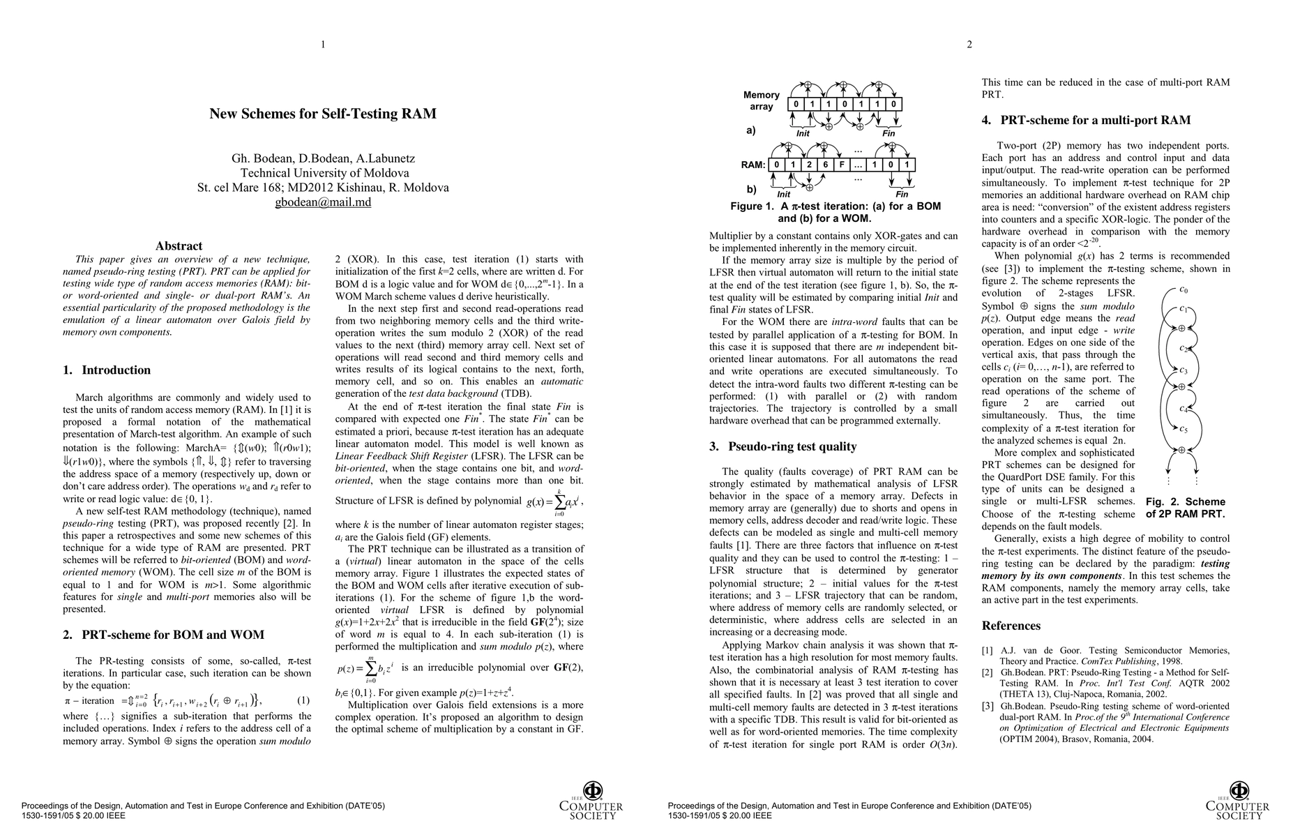 This paper gives an overview of a new technique, named pseudo-ring testing (PRT). PRT can be applied for testing wide type of random access memories (RAM): bit- or word-oriented and single- or dual-port RAM's. An essential particularity of the proposed methodology is the emulation of a linear automaton over Galois field by memory own components.