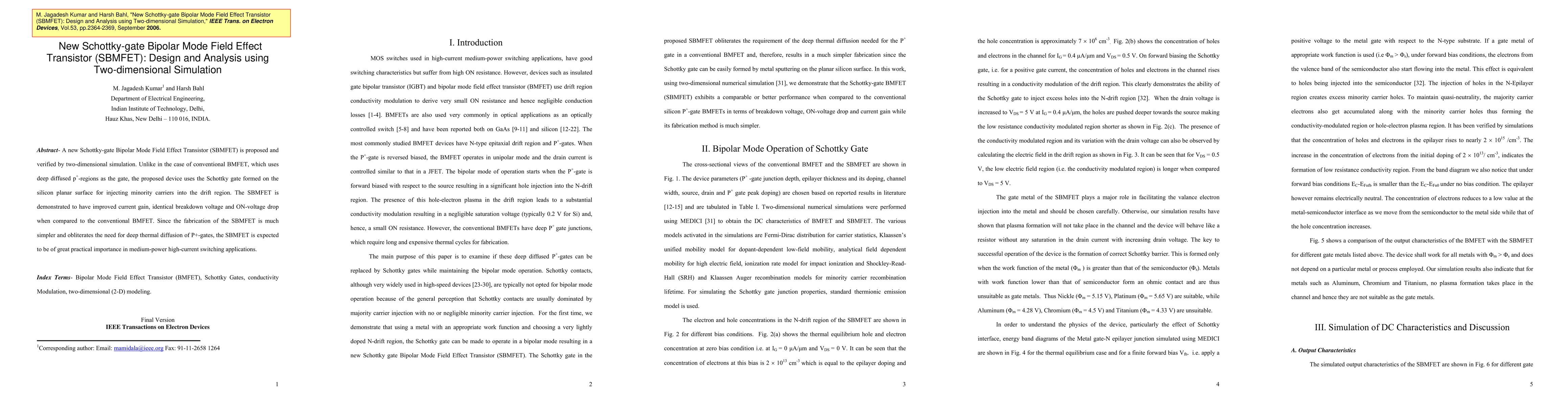 The paper proposes a new Schottky-gate Bipolar Mode Field Effect Transistor (SBMFET) with improved current gain and simpler fabrication compared to conventional BMFETs. The SBMFET uses a Schottky gate on the silicon surface, eliminating the need for deep p+-gate diffusion, and is shown to be effective in medium-power high-current switching applications.