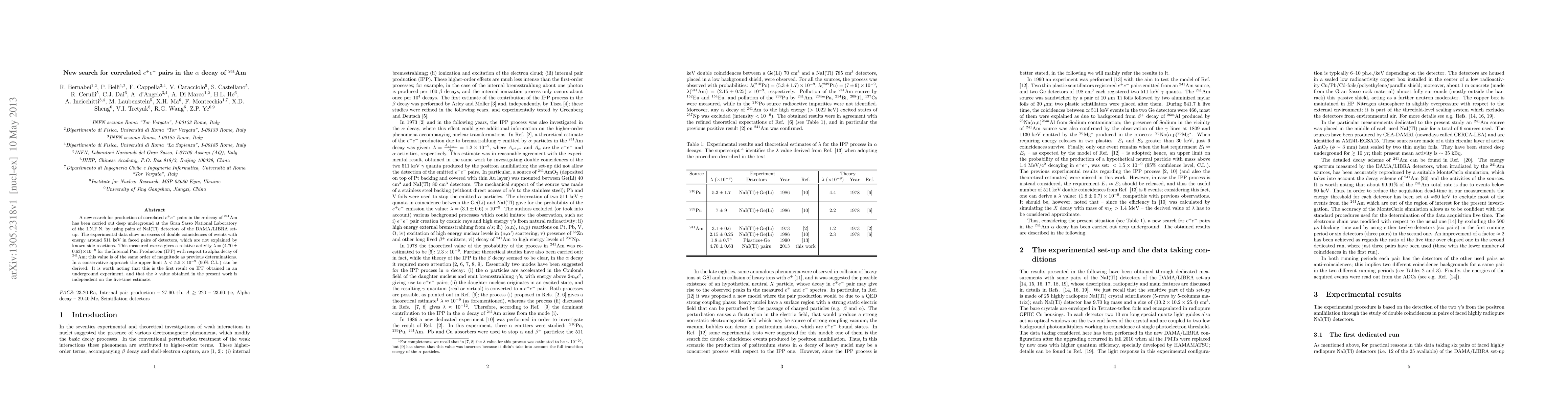 A new search for production of correlated e+e- pairs in the alpha decay of 241Am has been carried out deep underground at the Gran Sasso National Laboratory of the I.N.F.N. by using pairs of NaI(Tl) detectors of the DAMA/LIBRA set-up. The experimental data show an excess of double coincidences of events with energy around 511 keV in faced pairs of detectors, which are not explained by known side reactions. This measured excess gives a relative activity lambda = (4.70 \pm 0.63) \times 10^{-9} for the Internal Pair Production (IPP) with respect to alpha decay of 241Am; this value is of the same order of magnitude as previous determinations. In a conservative approach the upper limit lambda < 5.5 \times 10^{-9} (90% C.L.) can be derived. It is worth noting that this is the first result on IPP obtained in an underground experiment, and that the lambda value obtained in the present work is independent on the live-time estimate.