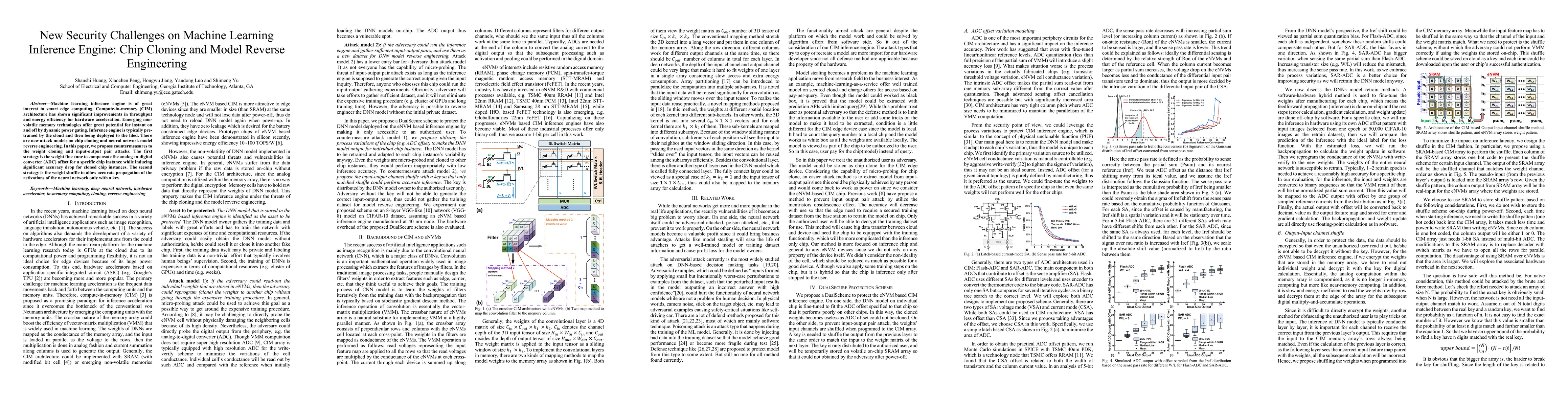 This paper addresses security challenges in machine learning inference engines, particularly focusing on chip cloning and model reverse engineering. It proposes countermeasures including weight fine-tuning to offset ADC variations and weight shuffling with fake rows insertion to secure neural network activations, ensuring accurate propagation only with a key.
