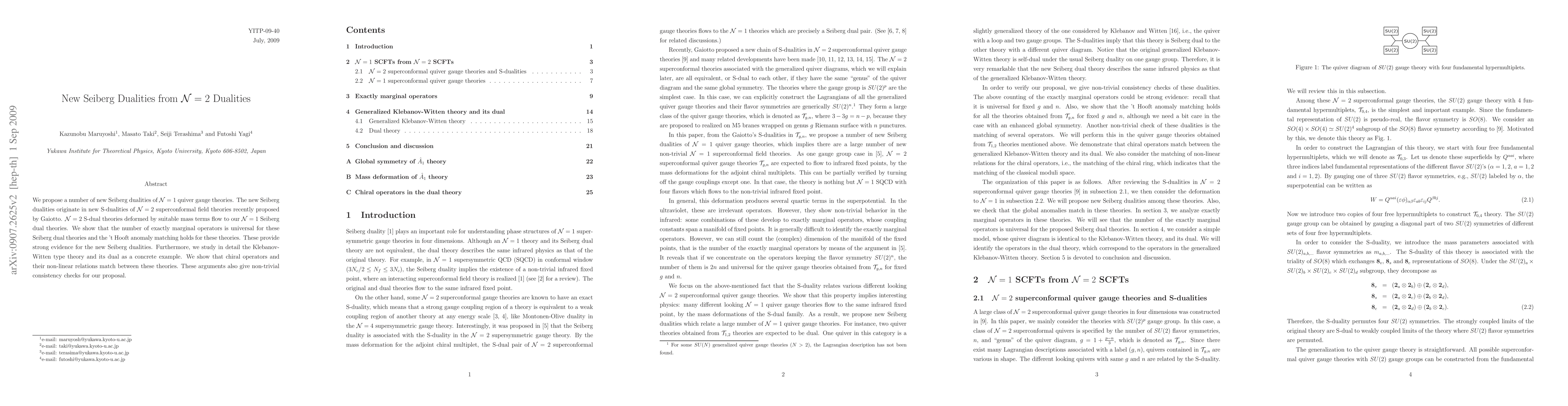 This paper proposes new Seiberg dualities for N=1 quiver gauge theories originating from recently proposed N=2 superconformal field theory S-dualities. The dual theories exhibit universal marginal operators and satisfy 't Hooft anomaly matching, providing strong evidence for the proposed dualities. A detailed analysis of the Klebanov-Witten type theory and its dual confirms matching chiral operators and non-linear relations, serving as consistency checks for the dualities.