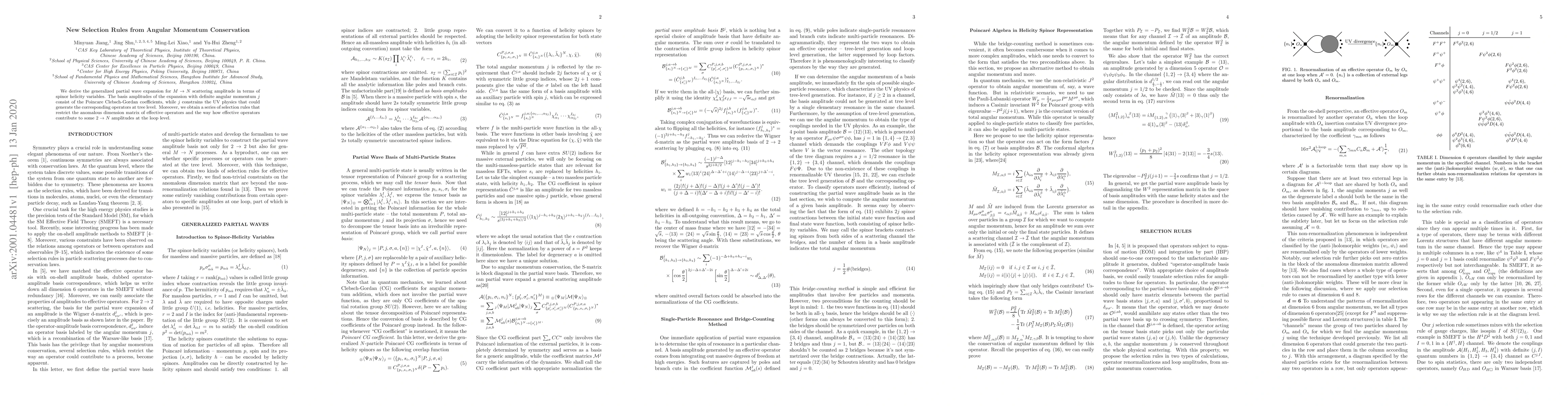 We derive the generalized partial wave expansion for $M \rightarrow N$ scattering amplitude in terms of spinor helicity variables. The basis amplitudes of the expansion with definite angular momentum $j$ consist of the Poincare Clebsch-Gordan coefficients, while $j$ constrains the UV physics that could generate the corresponding operators at tree level. Moreover, we obtain a series of selection rules that restrict the anomalous dimension matrix of effective operators and the way how effective operators contribute to some $2 \rightarrow N$ amplitudes at the loop level.