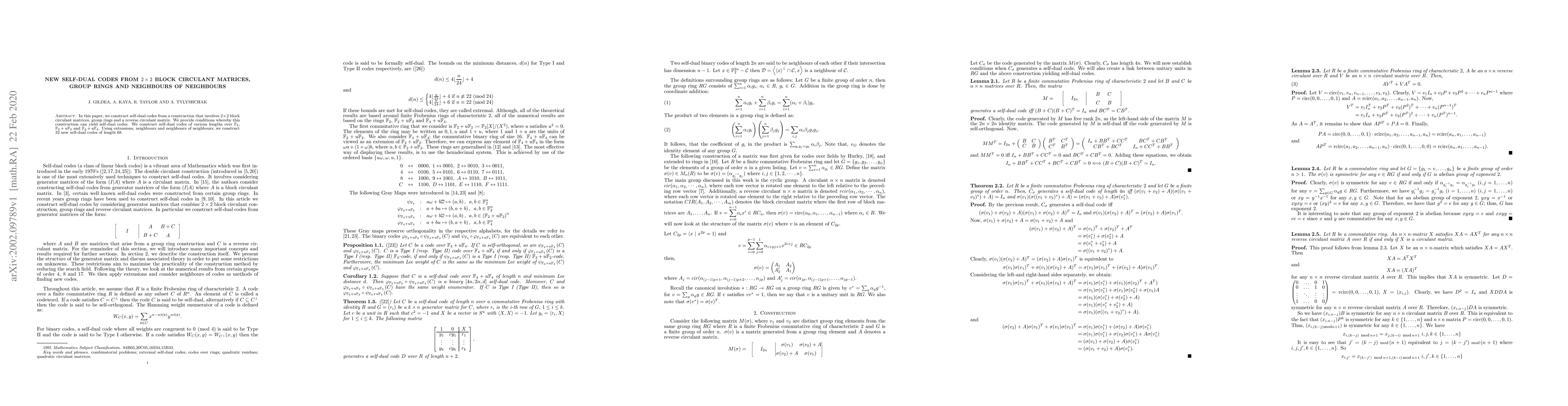 In this paper, we construct self-dual codes from a construction that involves 2x2 block circulant matrices, group rings and a reverse circulant matrix. We provide conditions whereby this construction can yield self-dual codes. We construct self-dual codes of various lengths over F2, F2 + uF2 and F4 + uF4. Using extensions, neighbours and neighbours of neighbours, we construct 32 new self-dual codes of length 68.