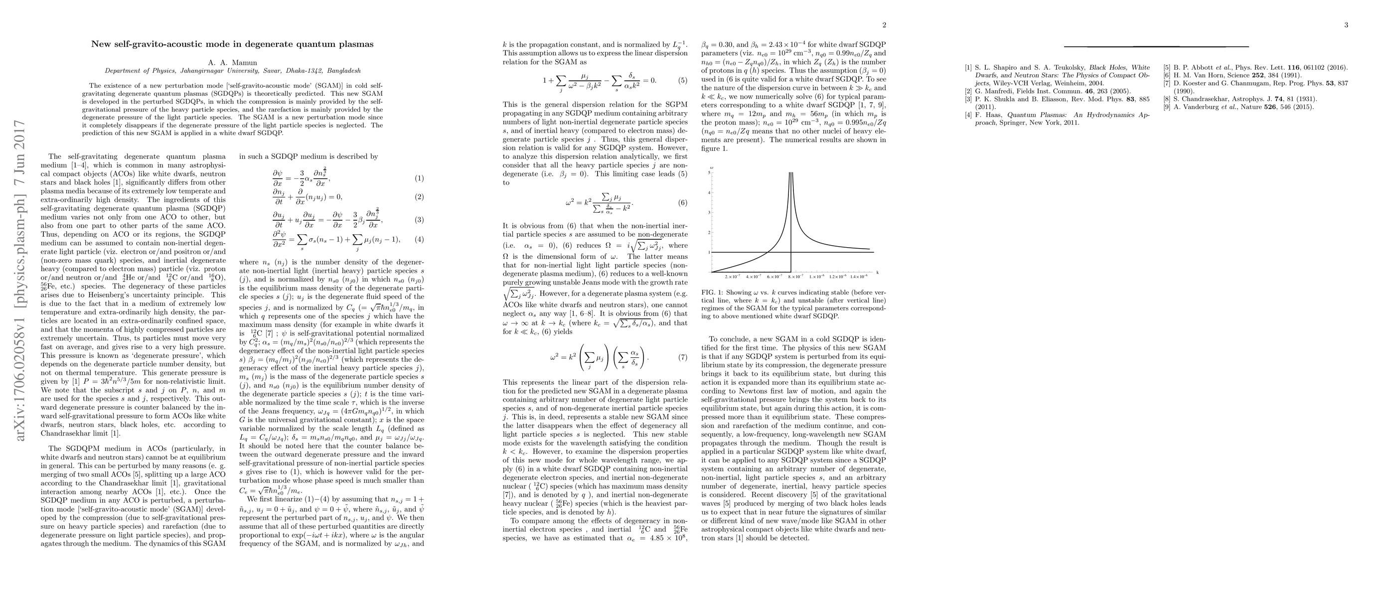 The existence of a new perturbation mode [`self-gravito-acoustic mode' (SGAM)] in cold self-gravitating degenerate quantum plasmas (SGDQPs) is theoretically predicted. This new SGAM is developed in the perturbed SGDQPs, in which the compression is mainly provided by the self-gravitational pressure of the heavy particle species, and the rarefaction is mainly provided by the degenerate pressure of the light particle species. The SGAM is a new perturbation mode since it completely disappears if the degenerate pressure of the light particle species is neglected. The prediction of this new SGAM is applied in a white dwarf SGDQP.