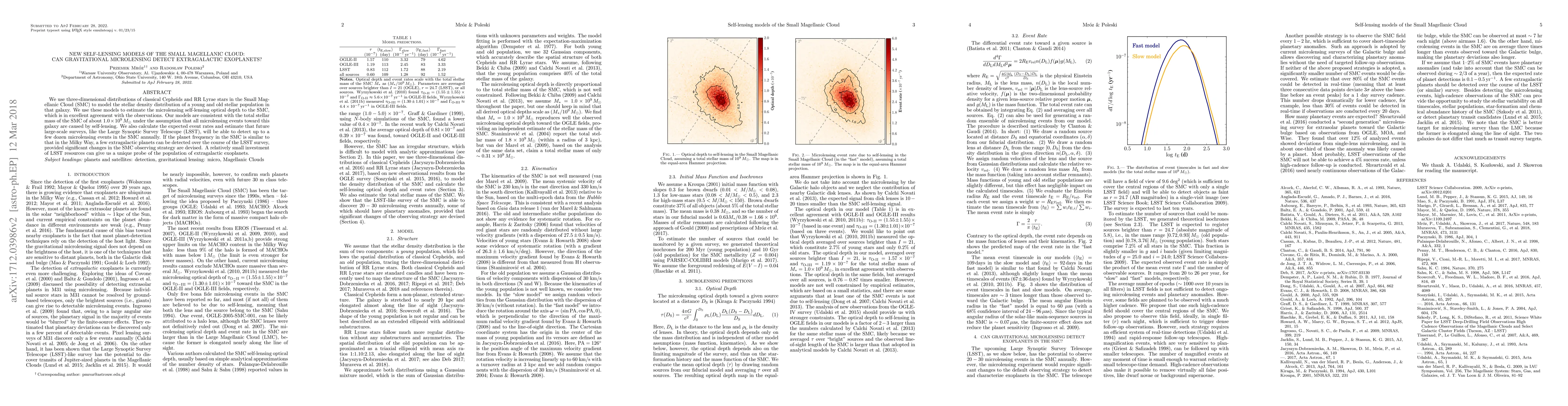 This paper models the stellar density distribution in the Small Magellanic Cloud (SMC) using Cepheids and RR Lyrae stars, finding agreement with observed microlensing optical depth. It predicts that future surveys like LSST could detect several dozen microlensing events annually, potentially revealing extragalactic exoplanets if the planet frequency is similar to that in the Milky Way.