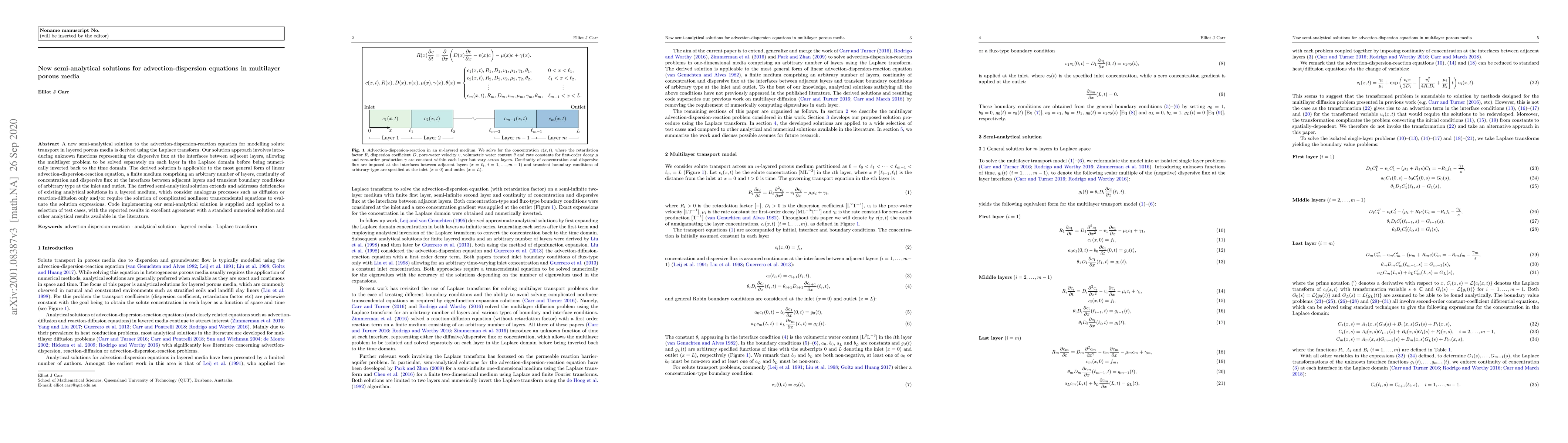This paper presents a new semi-analytical solution for the advection-dispersion-reaction equation in multilayer porous media using the Laplace transform, addressing deficiencies of existing methods and providing accurate results for transient boundary conditions. The solution is applicable to any number of layers and interfaces, and is validated through comparison with numerical and other analytical solutions.