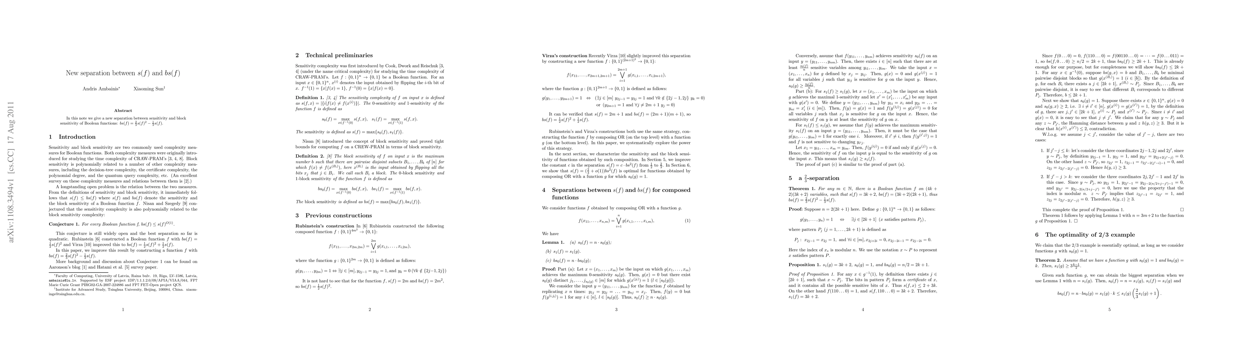 In this note we give a new separation between sensitivity and block sensitivity of Boolean functions: $bs(f)=(2/3)s(f)^2-(1/3)s(f)$.