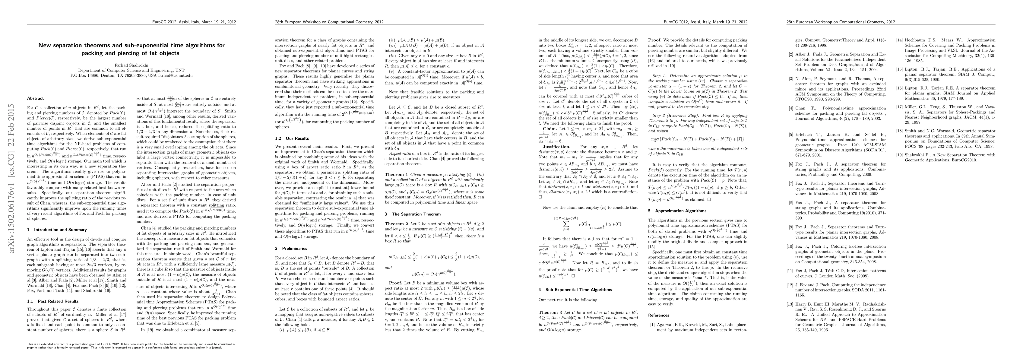 For $\cal C$ a collection of $n$ objects in $R^d$, let the packing and piercing numbers of $\cal C$, denoted by $Pack({\cal C})$, and $Pierce({\cal C})$, respectively, be the largest number of pairwise disjoint objects in ${\cal C}$, and the smallest number of points in $R^d$ that are common to all elements of ${\cal C}$, respectively. When elements of $\cal C$ are fat objects of arbitrary sizes, we derive sub-exponential time algorithms for the NP-hard problems of computing ${Pack}({\cal C})$ and $Pierce({\cal C})$, respectively, that run in $n^{O_d({{Pack}({\cal C})}^{d-1\over d})}$ and $n^{O_d({{Pierce}({\cal C})}^{d-1\over d})}$ time, respectively, and $O(n\log n)$ storage. Our main tool which is interesting in its own way, is a new separation theorem. The algorithms readily give rise to polynomial time approximation schemes (PTAS) that run in $n^{O({({1\over\epsilon})}^{d-1})}$ time and $O(n\log n)$ storage. The results favorably compare with many related best known results. Specifically, our separation theorem significantly improves the splitting ratio of the previous result of Chan, whereas, the sub-exponential time algorithms significantly improve upon the running times of very recent algorithms of Fox and Pach for packing of spheres.
